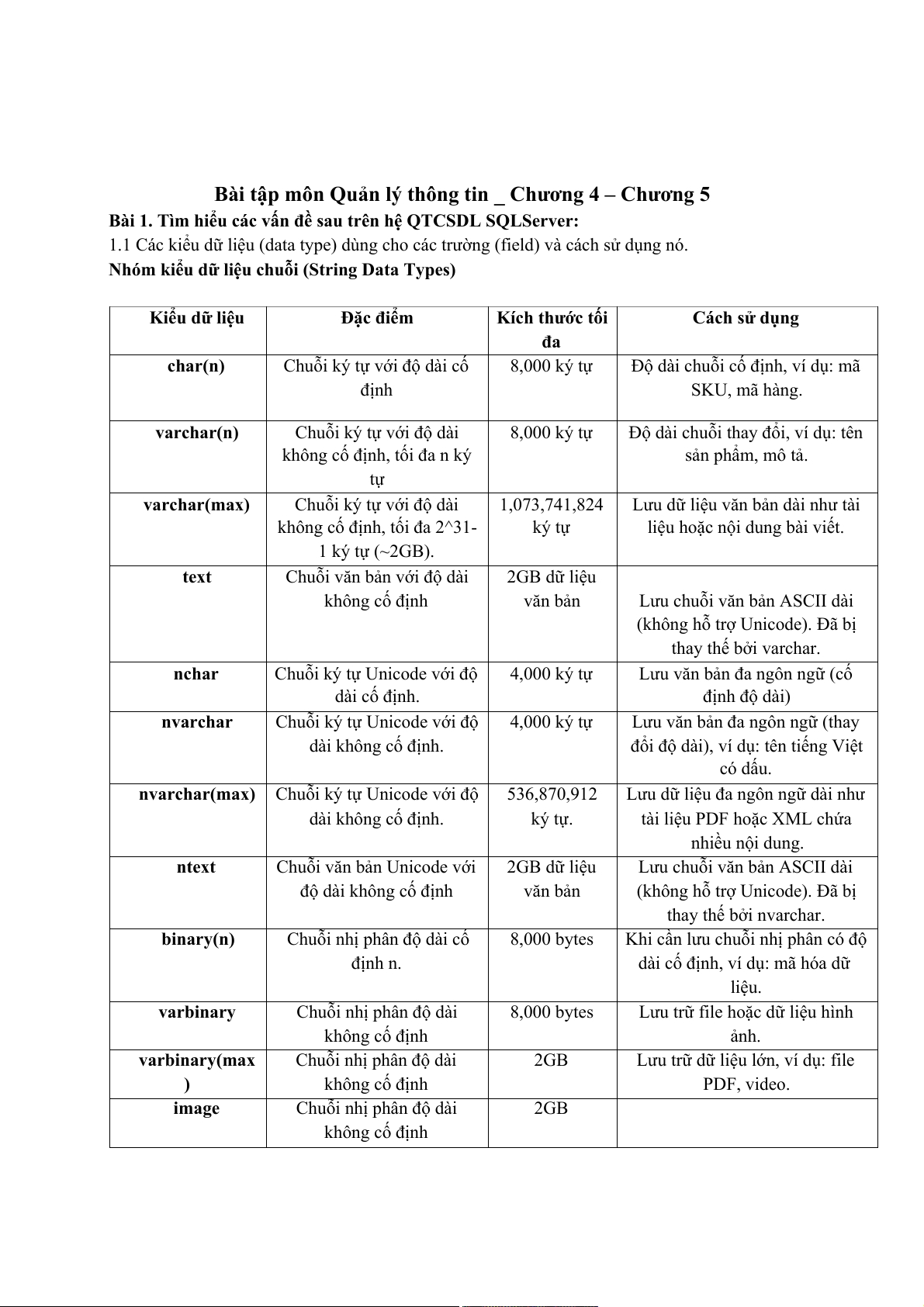 * Lưu ý: Nếu một cột chứa dữ liệu kiểu VARCHAR, NVARCHAR, VARBINARY,