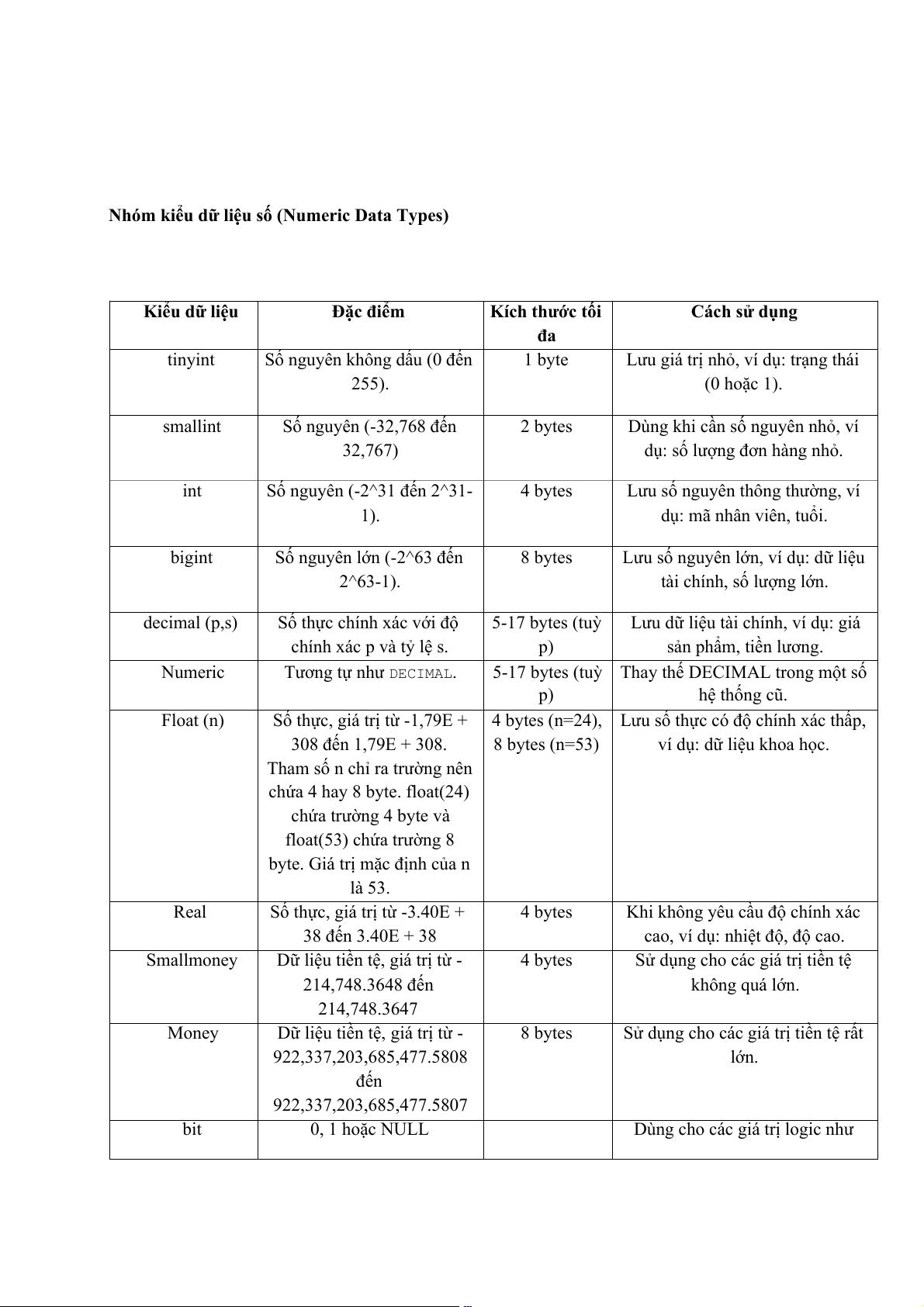 Nhóm kiểu dữ liệu số (Numeric Data Types) Kiểu dữ liệu Đặc điểm Kích thước tối Cách sử dụng đa tinyint