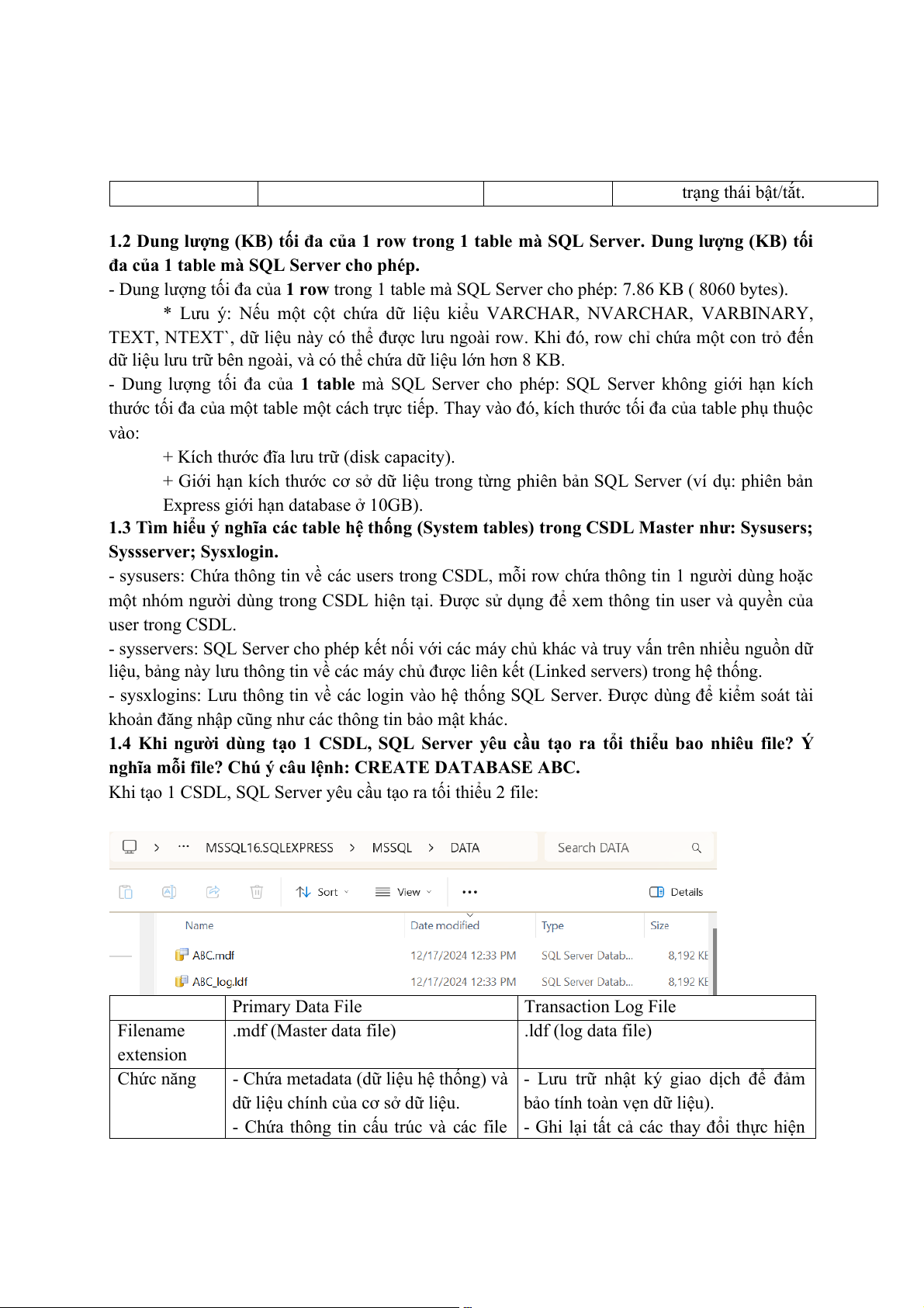 1.4 Khi người dùng tạo 1 CSDL, SQL Server yêu cầu tạo ra tổi thiểu bao nhiêu file? Ý
