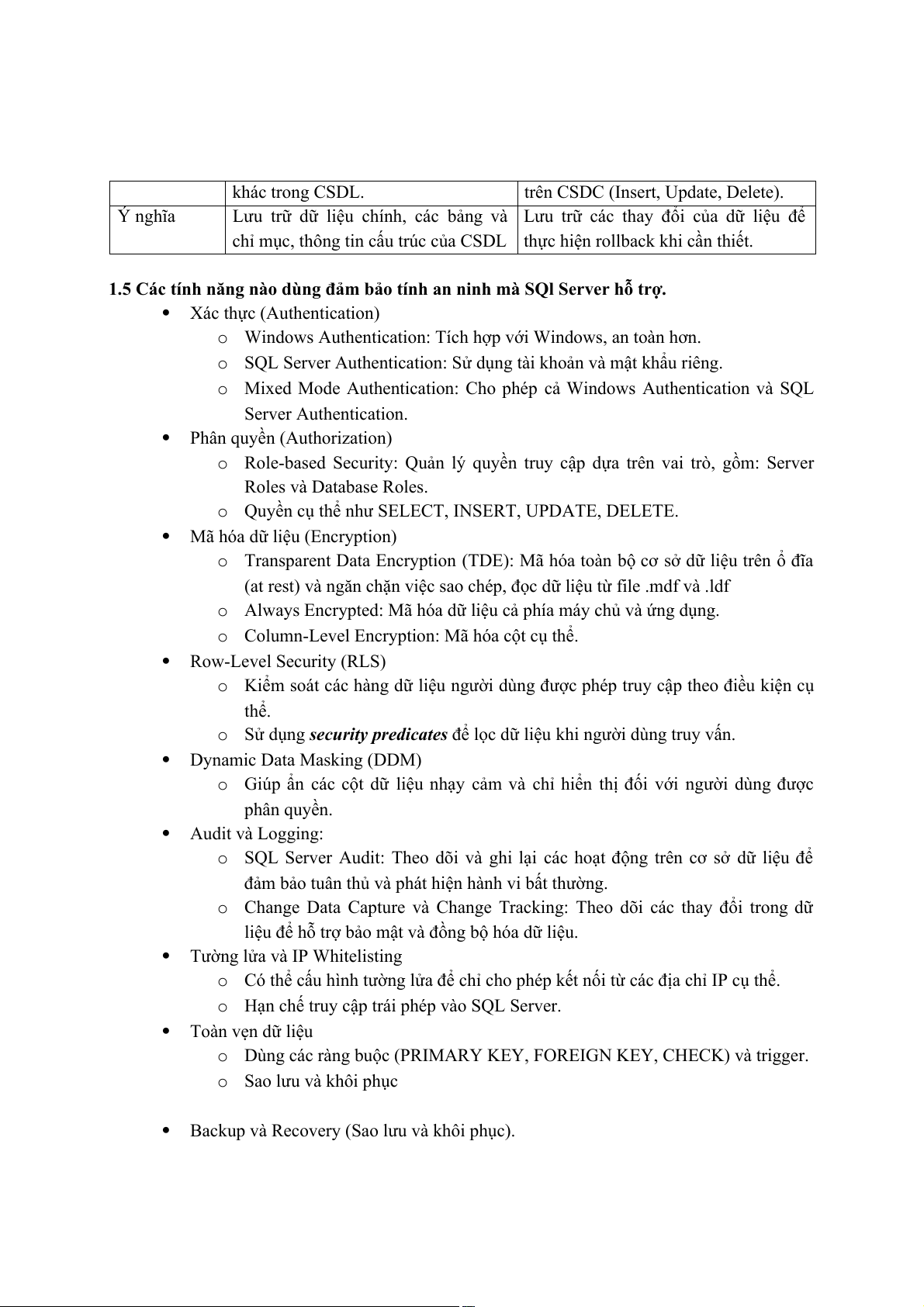 1.5 Các tính năng nào dùng đảm bảo tính an ninh mà SQl Server hỗ trợ. Xác thực (Authentication) o