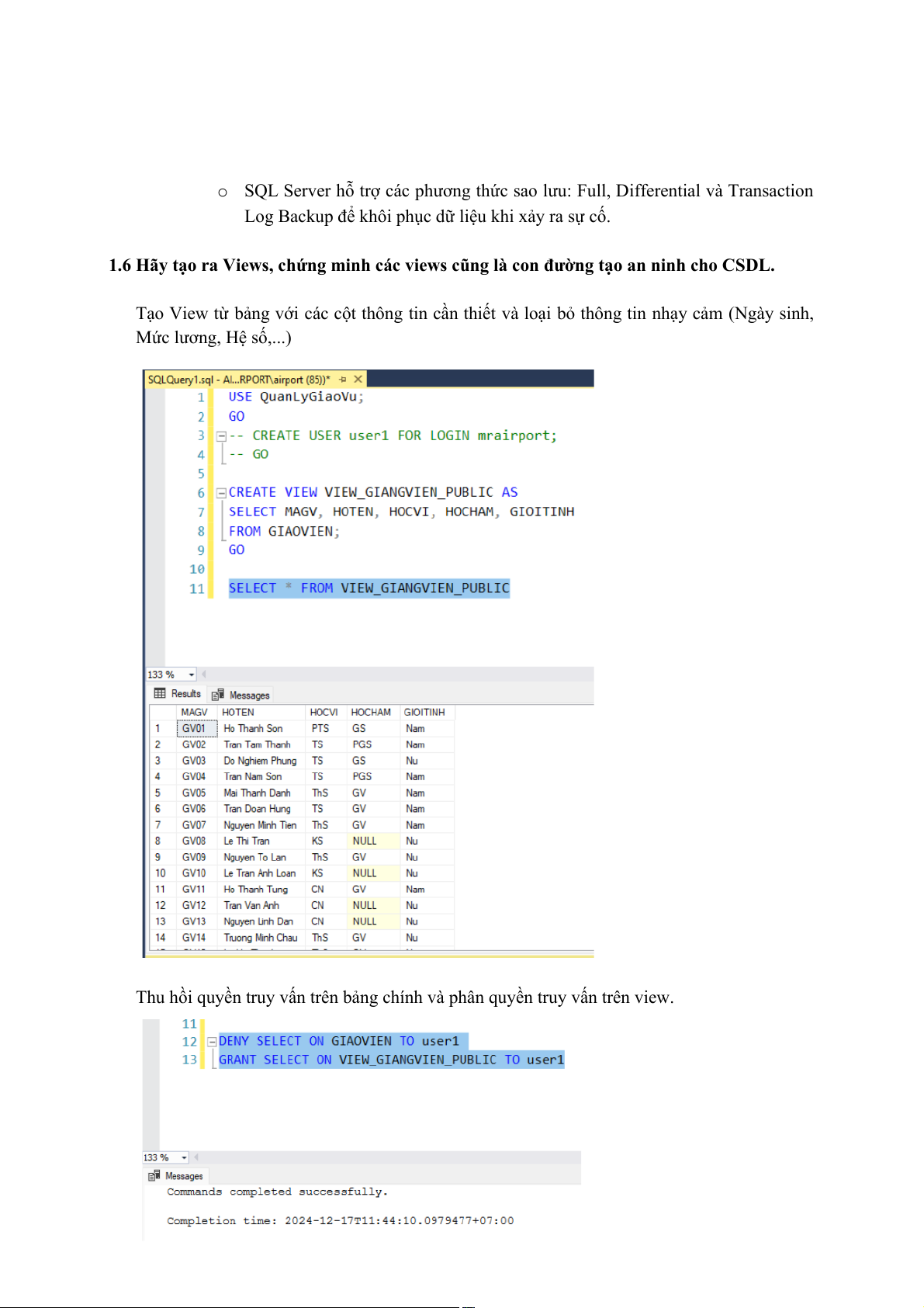 1.6 Hãy tạo ra Views, chứng minh các views cũng là con đường tạo an ninh cho CSDL.