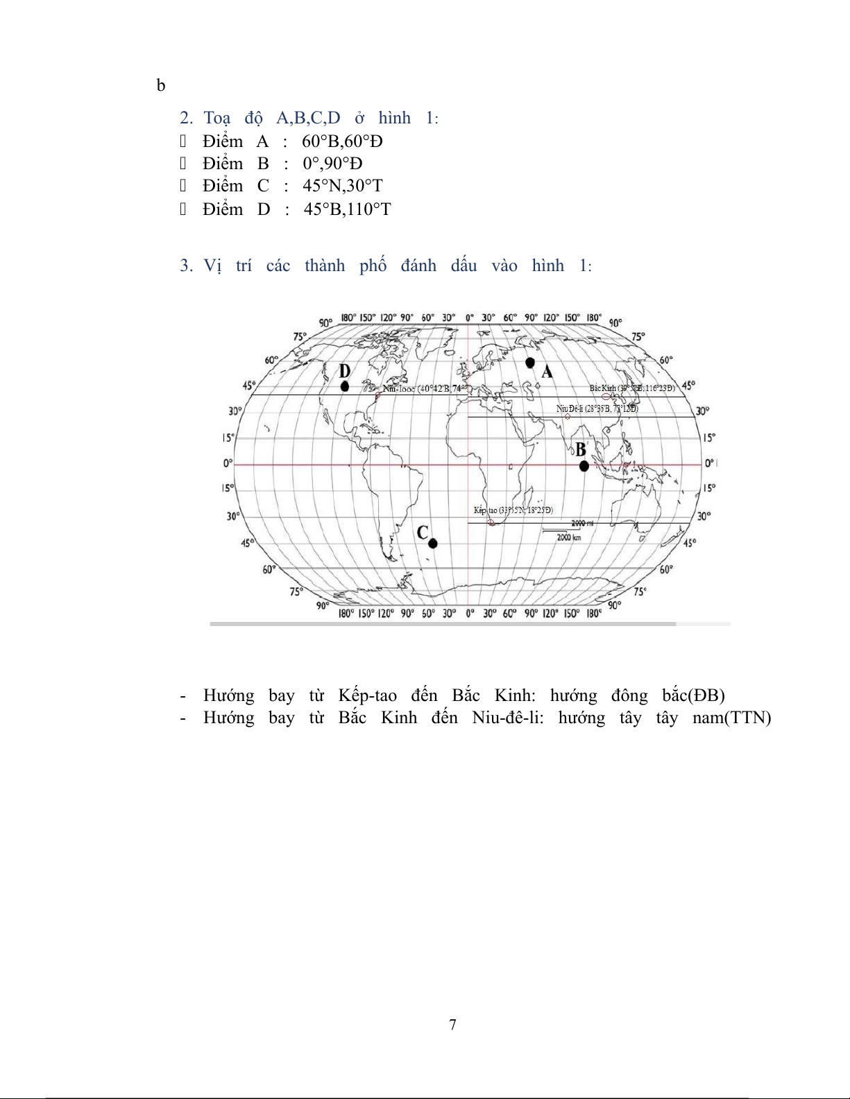 2. Toạ độ A,B,C,D ở hình 1: Điểm A : 60°B,60°Đ Điểm B : 0°,90°Đ Điểm C : 45°N,30°T Điểm D : 45°B,110°T