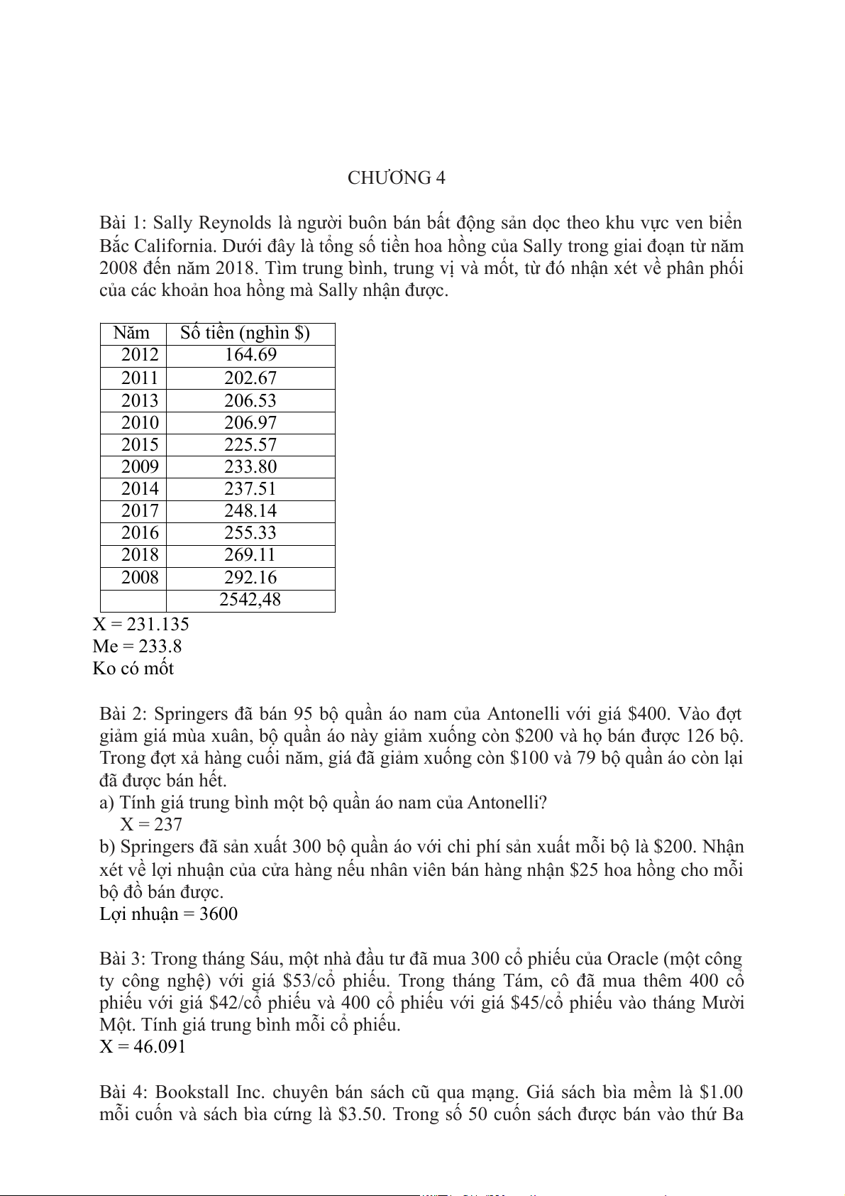 của các khoản hoa hồng mà Sally nhận được. Năm Số tiền (nghìn $) 2012 164.69 2011 202.67 2013 206.53 2010 206.97 2015 225.57 2009 233.80 2014 237.51 2017 248.14 2016 255.33 2018 269.11 2008 292.16 2542,48 X = 231.135 Me = 233.8 Ko có mốt