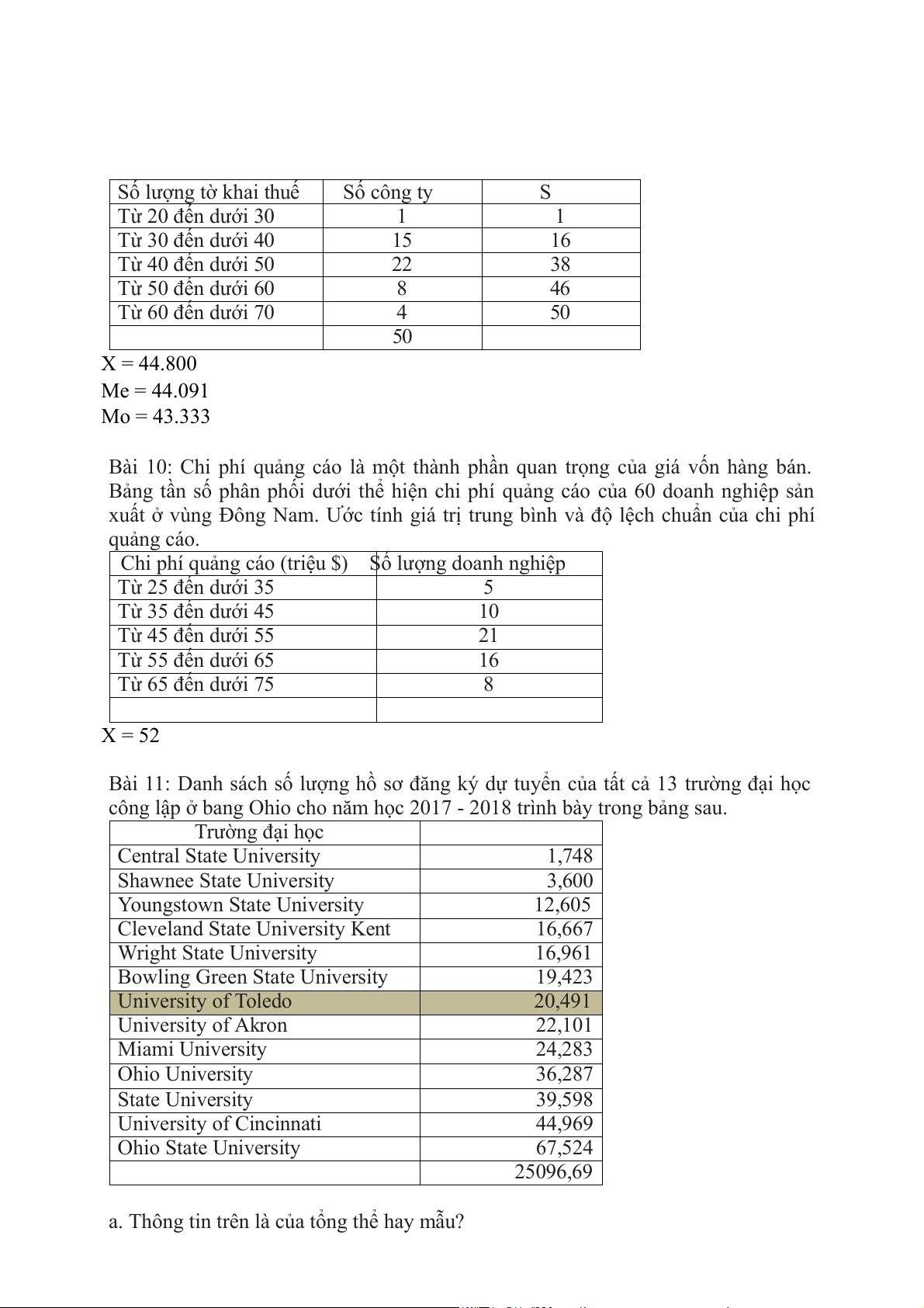 trung vị, mốt và độ lệch chuẩn. Số lượng tờ khai thuế Số công ty S Từ 20 đến dưới 30 1 1 Từ 30 đến dưới 40 15 16 Từ 40 đến dưới 50 22 38 Từ 50 đến dưới 60 8 46 Từ 60 đến dưới 70 4 50 50 X = 44.800 Me = 44.091 Mo = 43.333