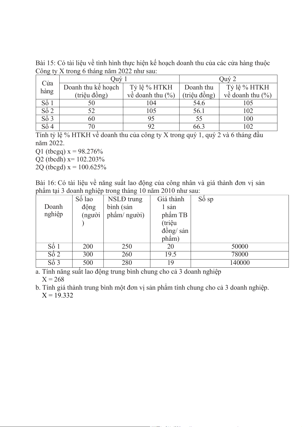 Bài 15: Có tài liệu về tình hình thực hiện kế hoạch doanh thu của các cửa hàng thuộc