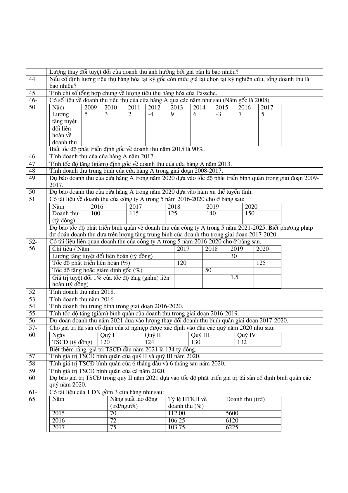 Có tài liệu của 1 DN gồm 3 cửa hàng như sau: 65 Năm Năng suất lao động Tỷ lệ HTKH về Doanh thu (trđ) (trđ/người) doanh thu (%) 2015 70 112.00 5600 2016 72 106.25 6120 2017 75 103.75 6225 2018 75.6 90.00 6804 2019 82 92.00 7544 61