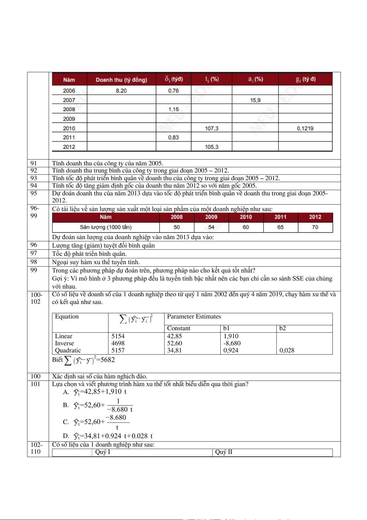 Có số liệu về doanh số của 1 doanh nghiệp theo từ quý 1 năm 2002 đến quý 4 năm 2019, chạy hàm xu thế và 102 có kết quả như sau. Equation ∑ (^ y − y i i )2 Parameter Estimates Constant b1 b2 Linear 5154 42,85 1,910 Inverse 4698 52,60 -8,680 Quadratic 5157 34,81 0,924 0,028 Biết ∑ ( ^ y − y i )2=5682 100