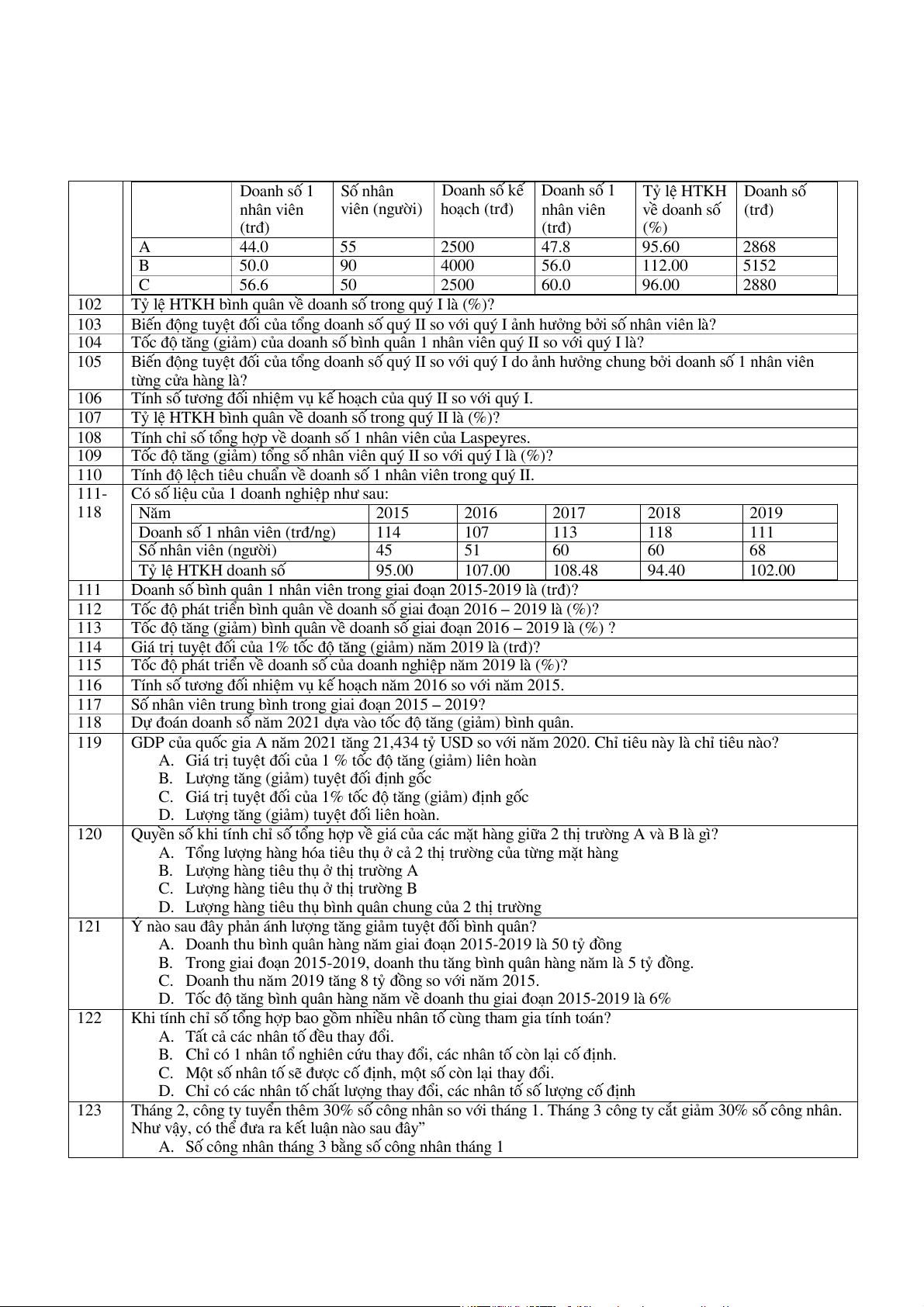 Tính chỉ số tổng hợp về doanh số 1 nhân viên của Laspeyres. 109