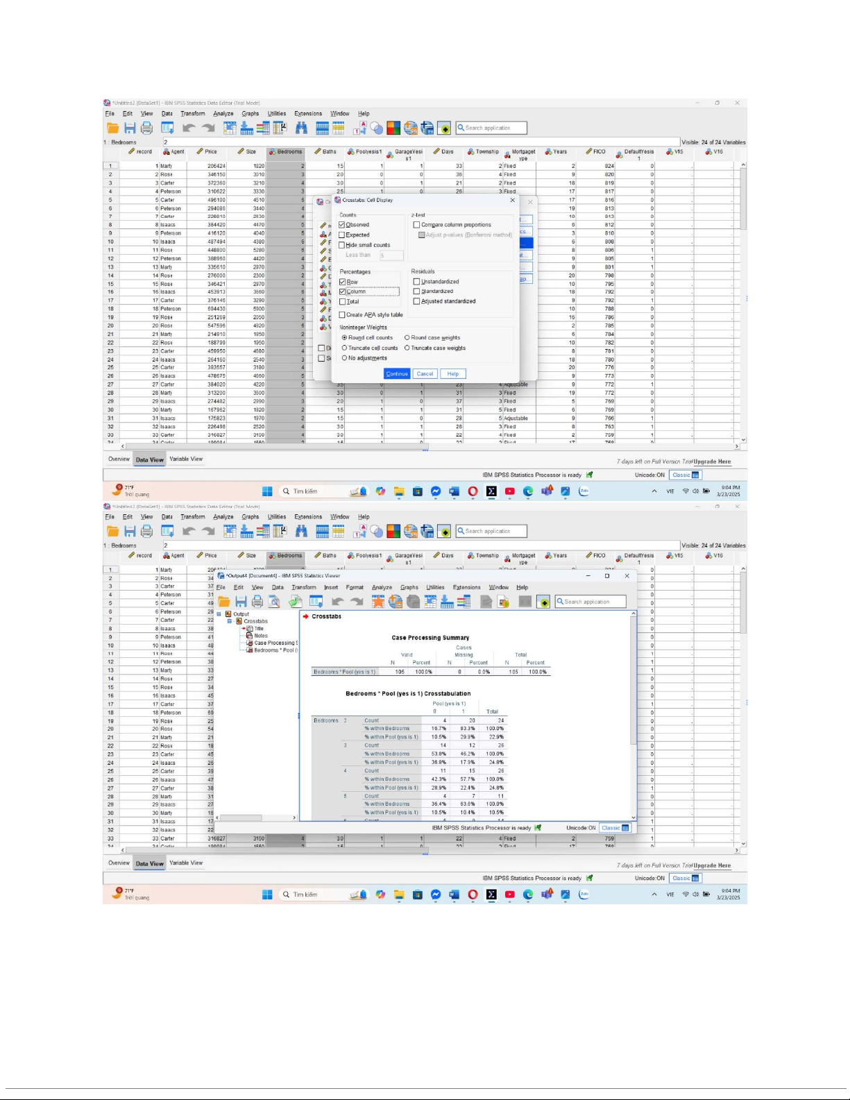 Câu 6: Lập bảng chéo thể hiện mối quan hệ giữa biến Bedroom và biến Pool.