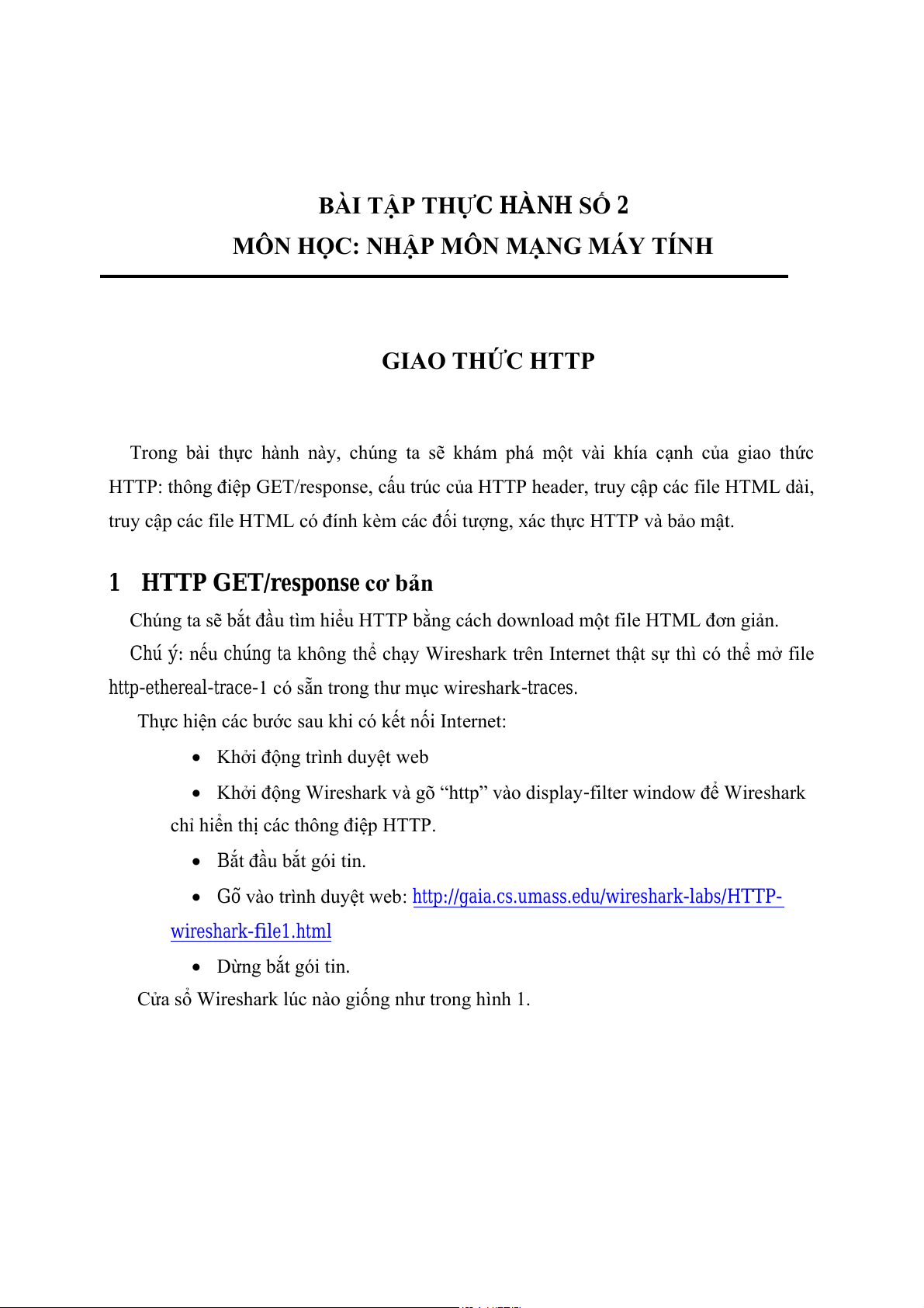 • Gõ vào trình duyệt web: ht p:/ gaia.cs.umass.edu/wireshark-labs/HTTP- wireshark-file1.html • Dừng bắt gói tin.