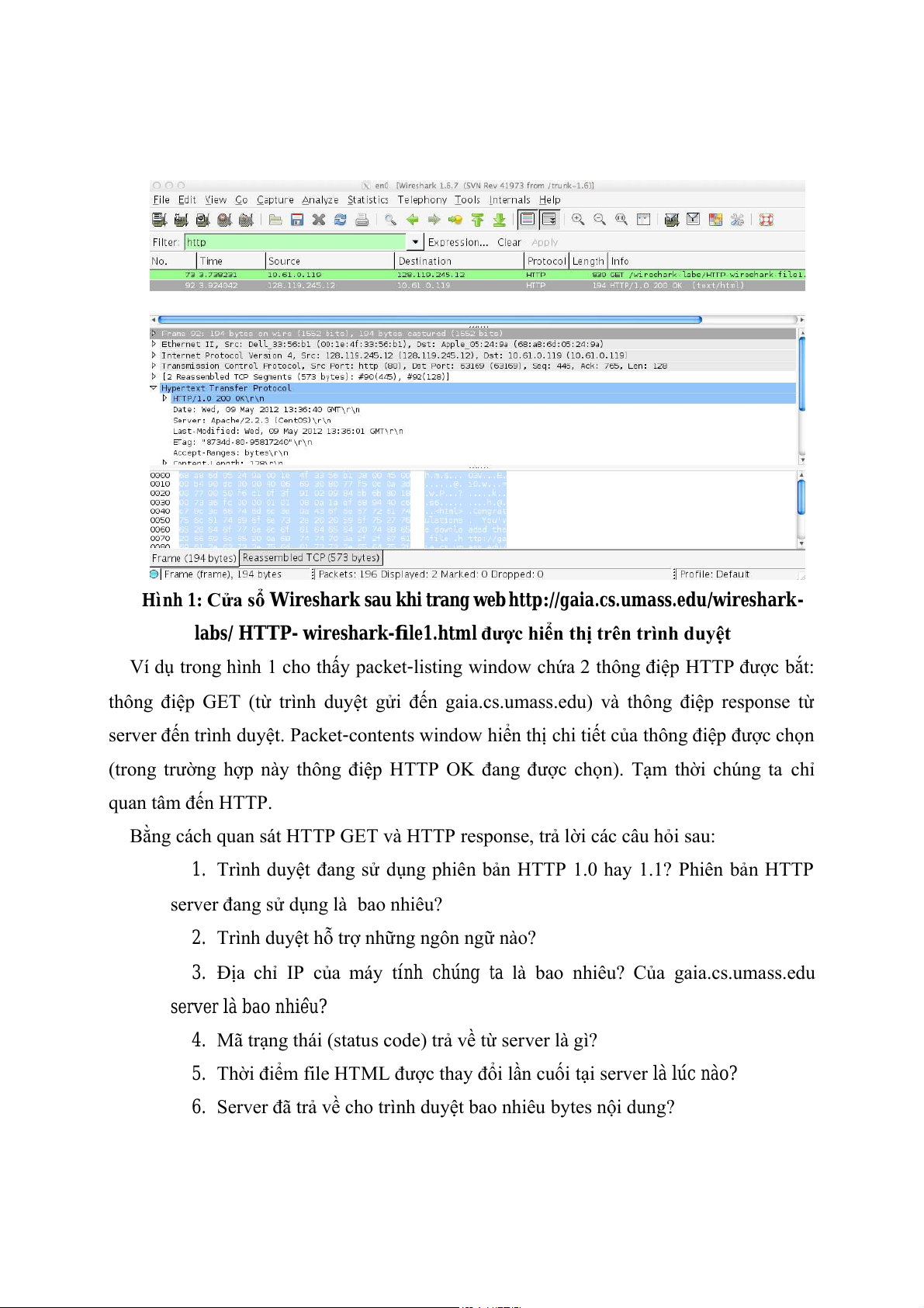 thông điệp GET (từ trình duyệt gửi đến gaia.cs.umass.edu) và thông điệp response từ