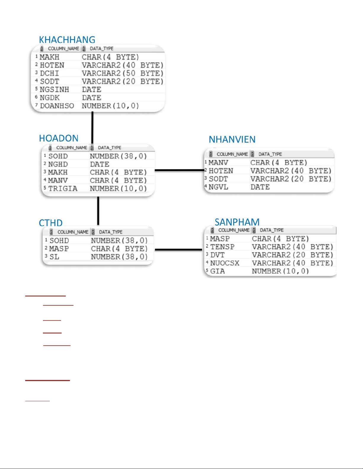 ----------------------------------------- -------- ---------------------------- SOHD NOT NULL NUMBER(38) MASP NOT NULL CHAR(4) SL NUMBER(38) SQL> CREATE TABLE CTHD( SOHD number(38,0) not null, MASP char(4 byte), SL number(38,0),