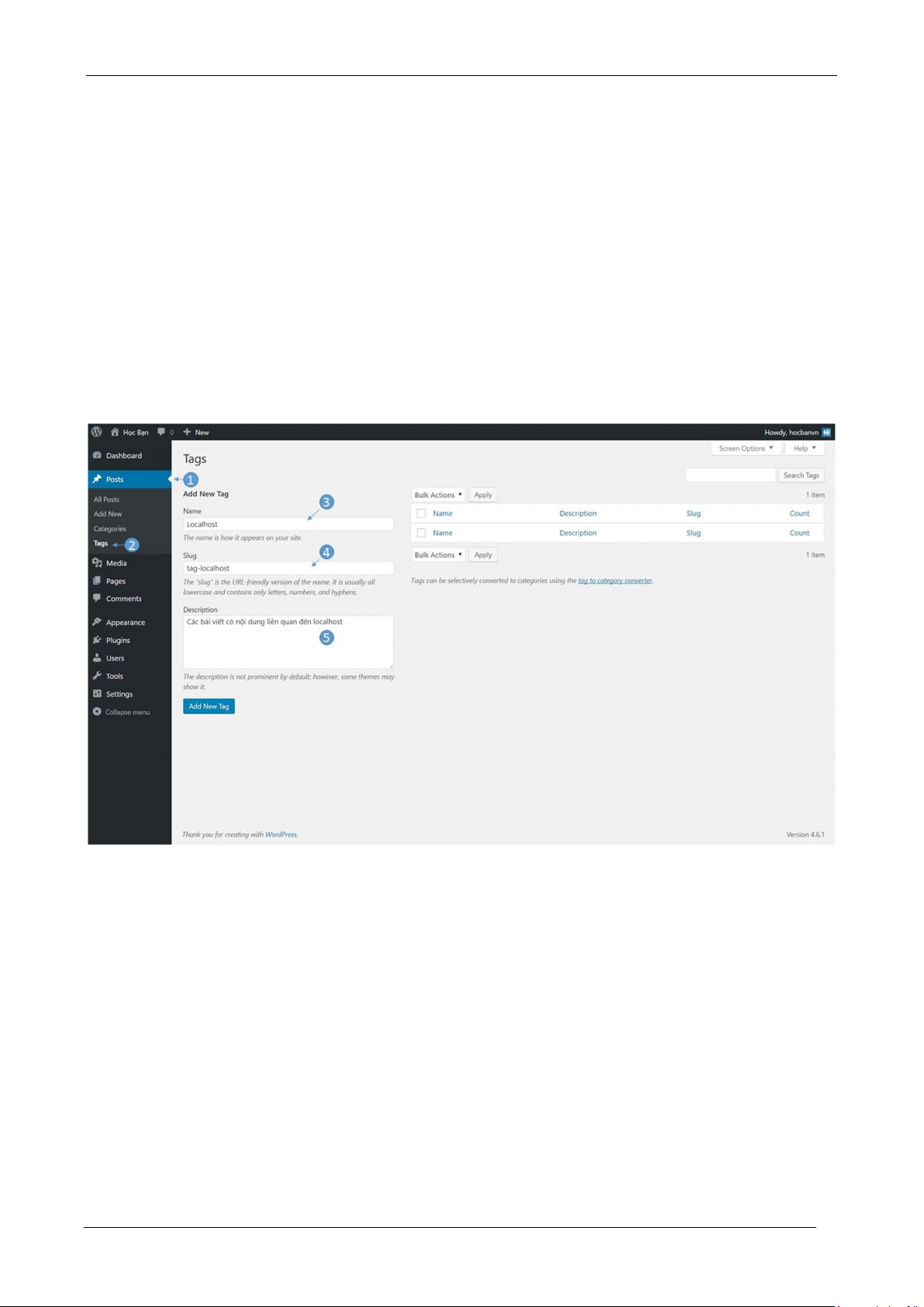 Để tạo sẵn các Tags, từ trang Dashboard >> Posts >> Tags và điền các thông tin tương tự như