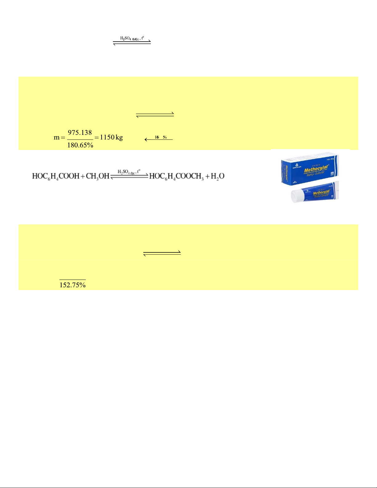 mmethyl salicylate (3,8 triệu tuýp) = 2,7.1,9.106 = 5,13.106 gam = 5,13 tấn. H2SO4 ®Æc , to HOC H COOH + CH OH HOC H COOCH + H O 6 4 3 6 4 3 2 Khối lượng: 138 g → 152 g 5,13.138 m = salicylic acid = 6, 21 tấn ⎯H = 7⎯5%⎯ 5,13 tấn