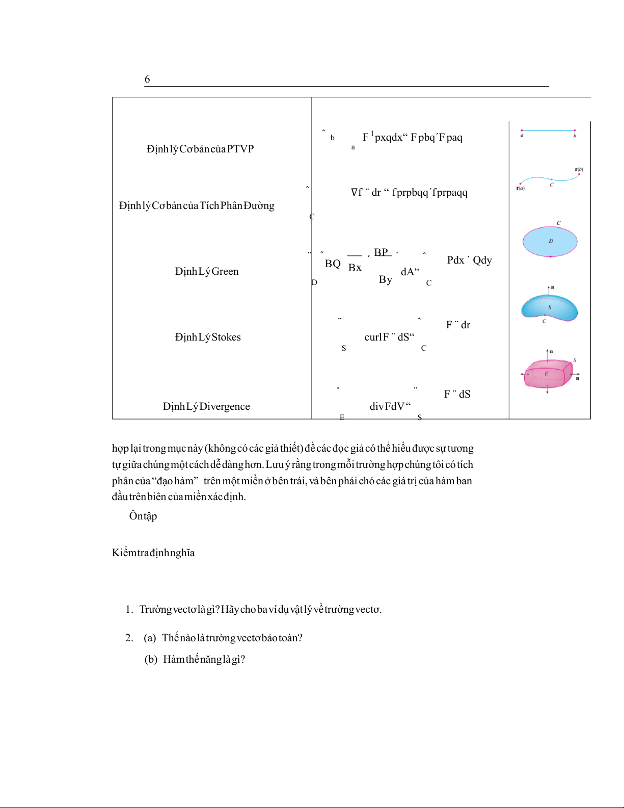 ĐịnhlýCơbảncủaTíchPhânĐường C ¨ ˆ BP ˙ ˆ BQ ´ Pdx ` Qdy ĐịnhLýGreen Bx dA“ D By C ¨ ˆ F ¨ dr ĐịnhLýStokes curlF ¨ dS“ S C ˚ ¨ F ¨ dS ĐịnhLýDivergence divFdV“ E S