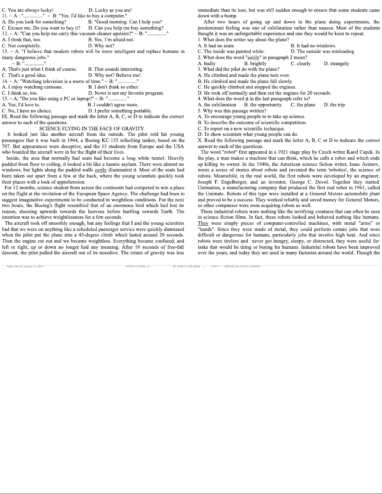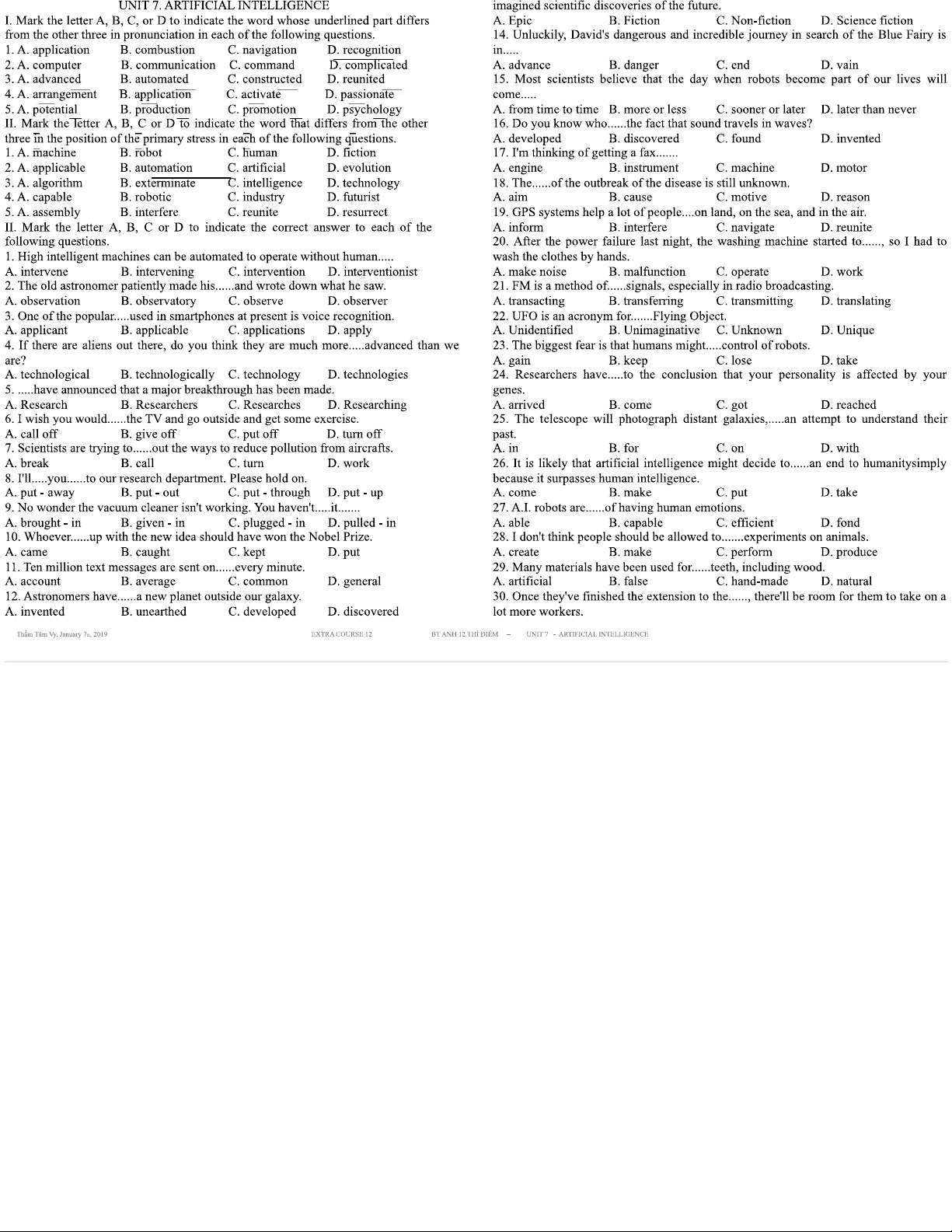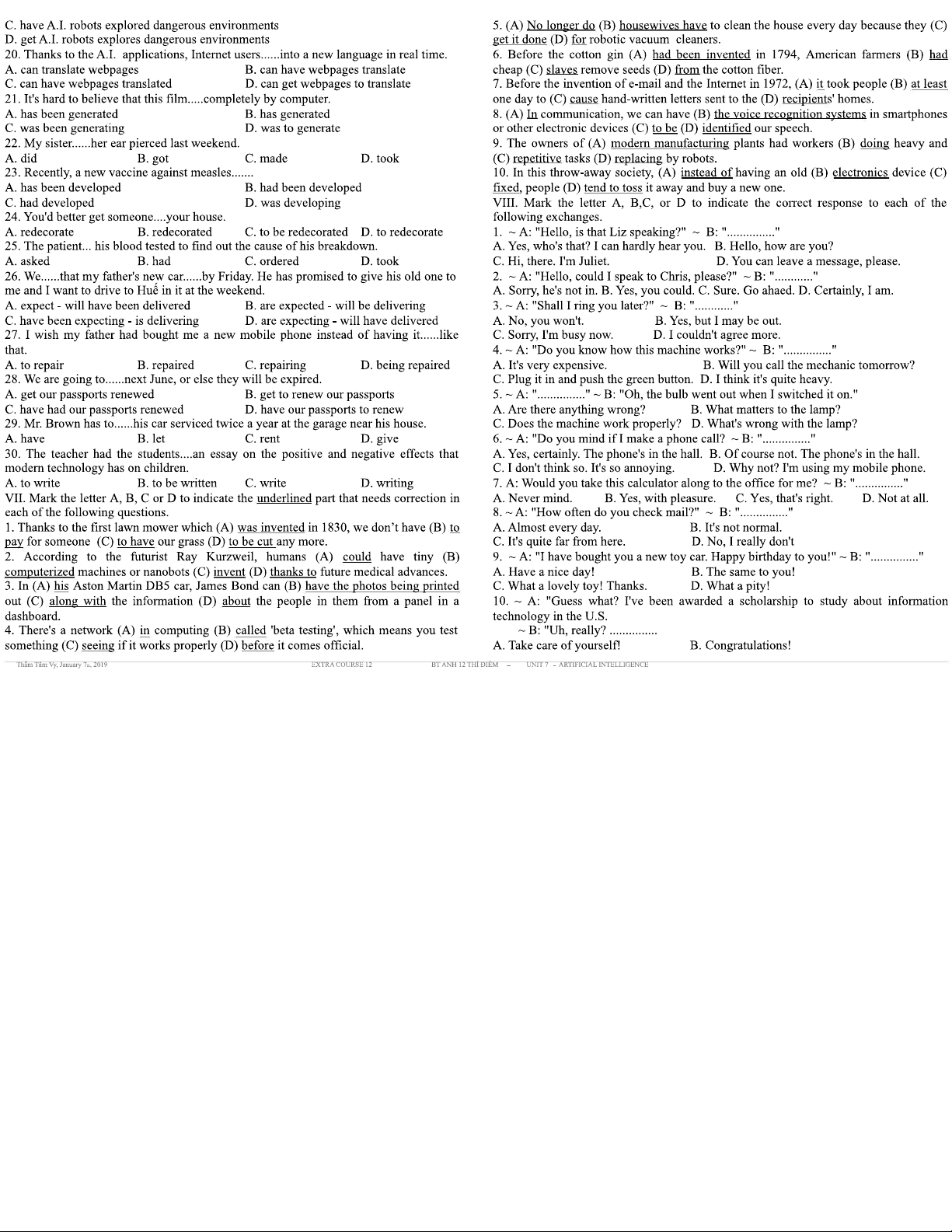 BÀI TẬP TIẾNG ANH 12 THÍ ĐIỂM - UNIT 7: ARTIFICIAL INTELLIGENCE
