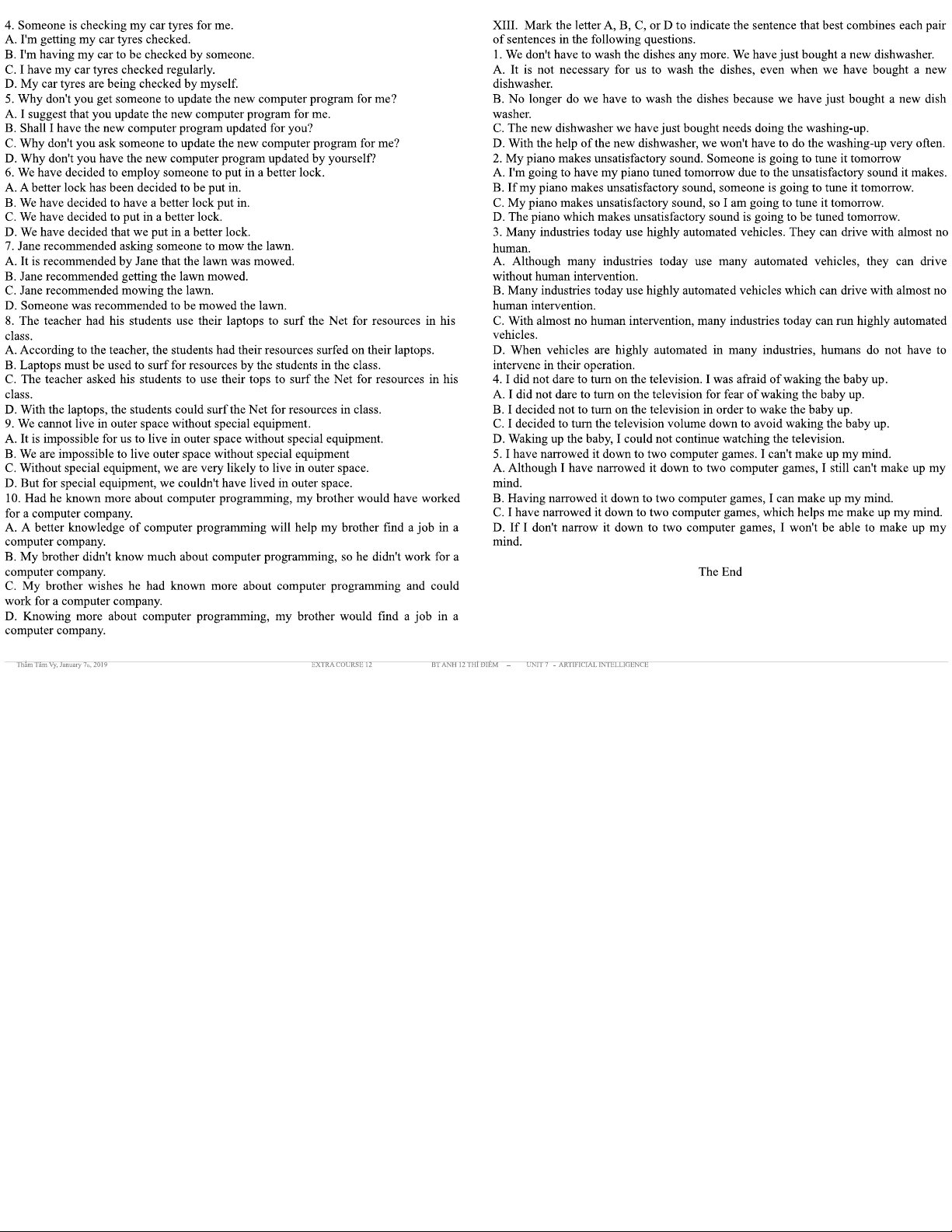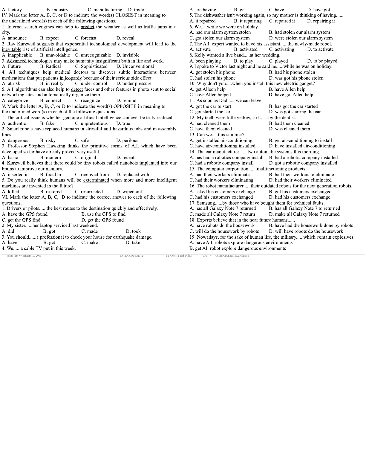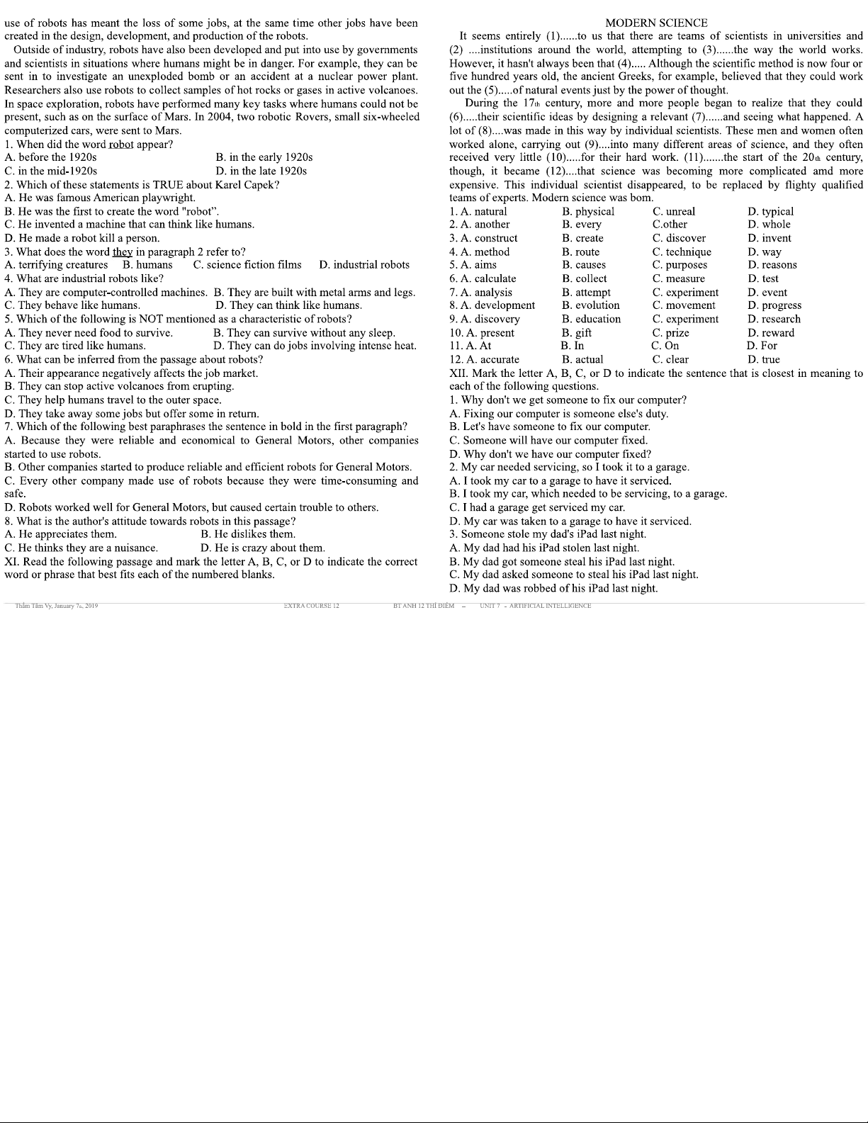 BÀI TẬP TIẾNG ANH 12 THÍ ĐIỂM - UNIT 7: ARTIFICIAL INTELLIGENCE