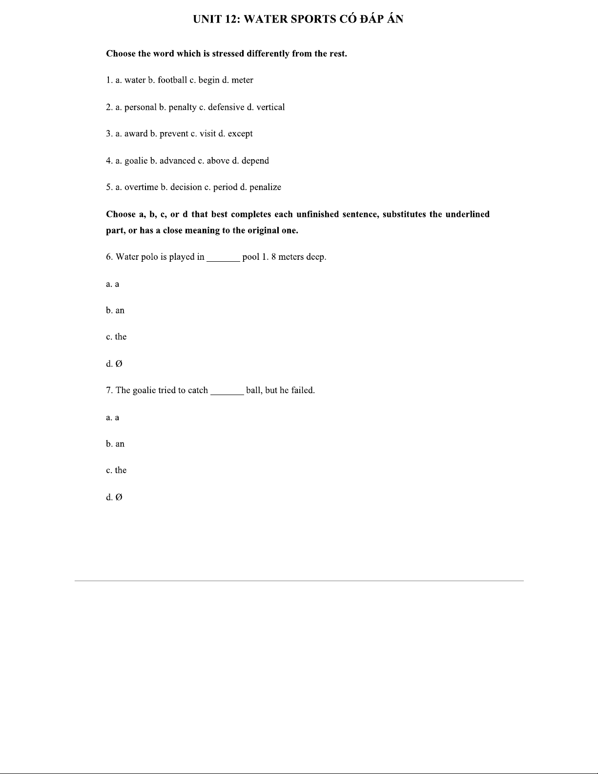 Bài Tập Tiếng Anh Lớp 12 - Unit 12: Water Sports Có Đáp Án