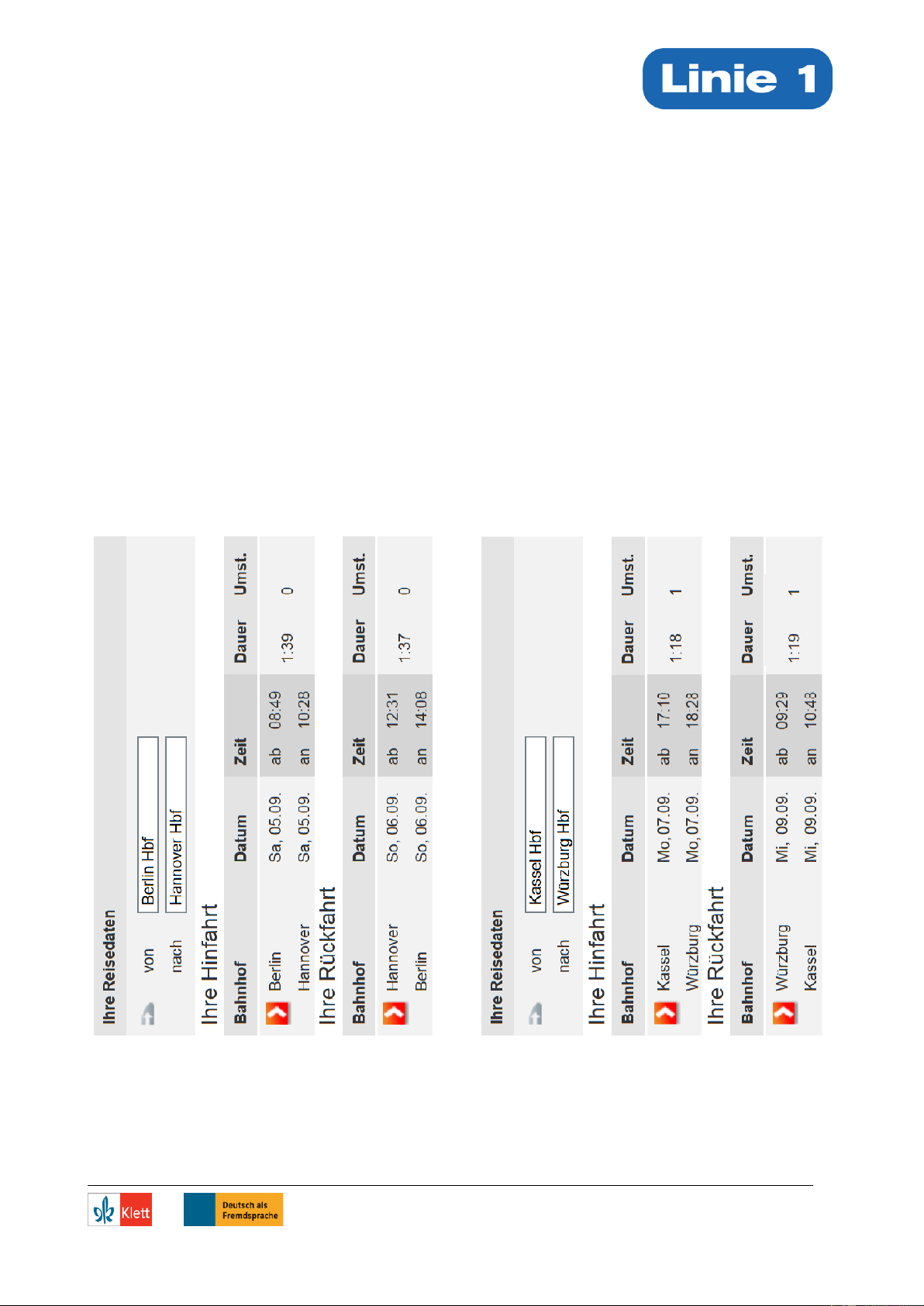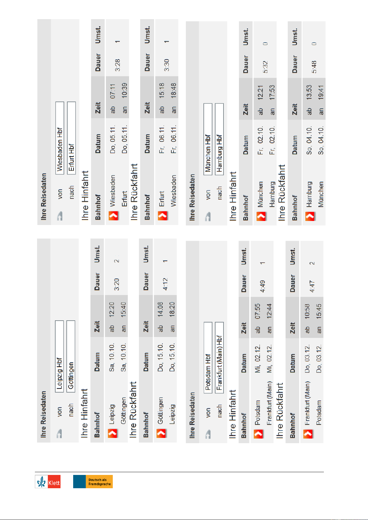 ○ Also: Hinfahrt am … und Rückfahrt am … . Um wie viel Uhr? …