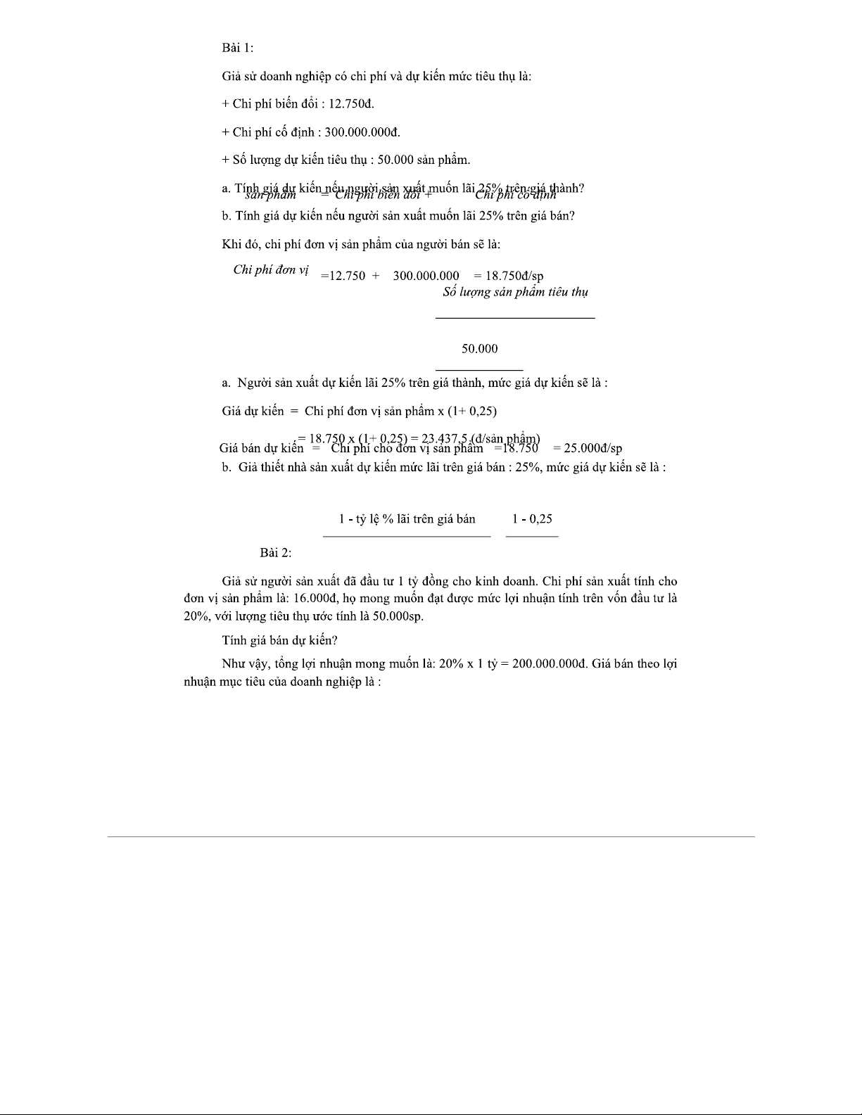 Bài Tập - Tính Giá Sản Phẩm và Lợi Nhuận Doanh Nghiệp