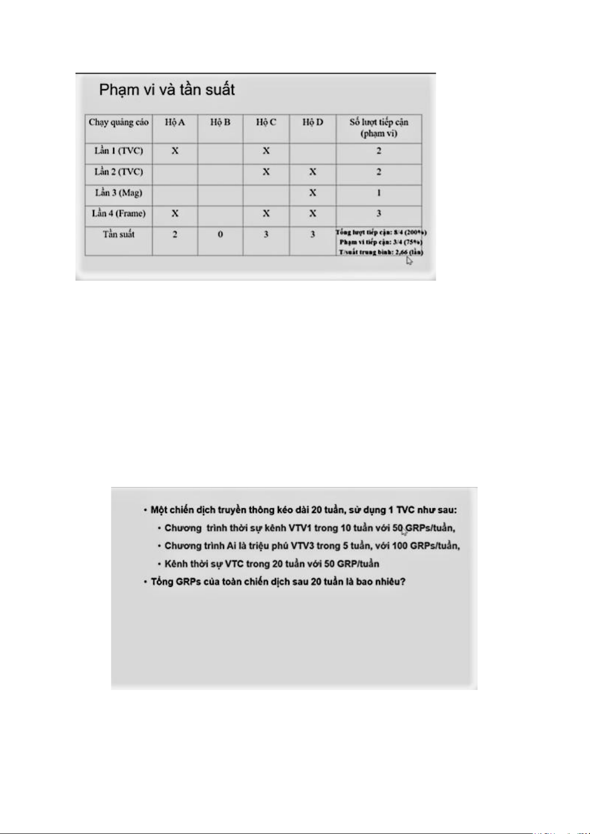 ⇒ Tần suất TB = GRP/Reach = 200/75 = 2,67 (lần) Bài 2