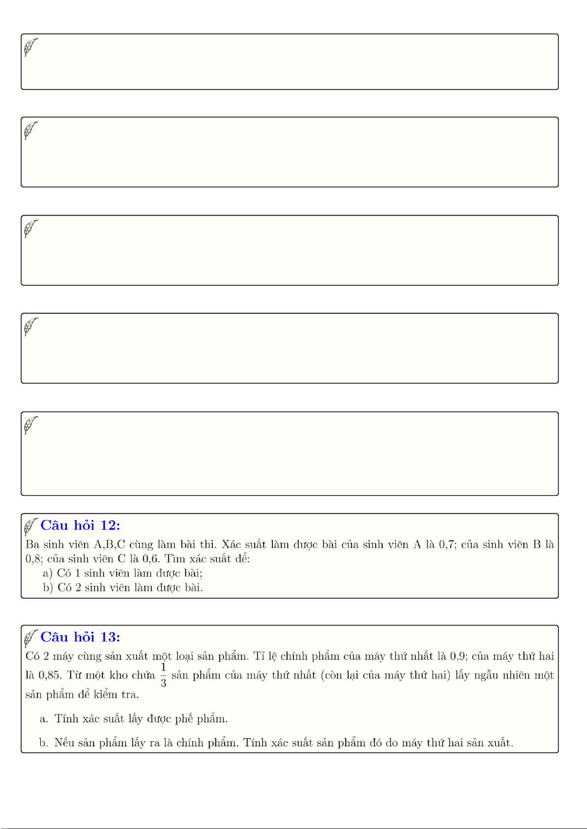 sản phẩm. Lấy ngẫu nhiên trong các sản phẩm còn lại 1 sản phẩm. Tính xác suất để lấy được một sản phẩm loại A? Câu hỏi 11: