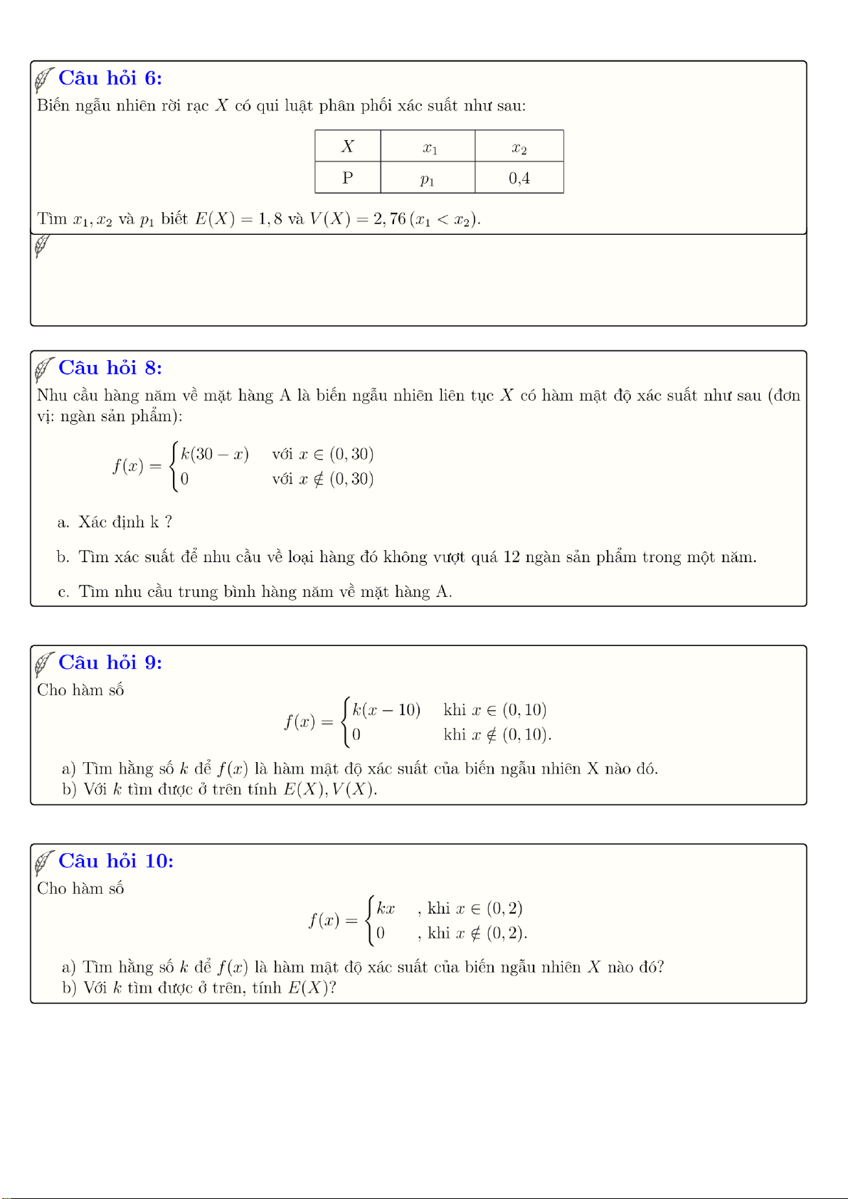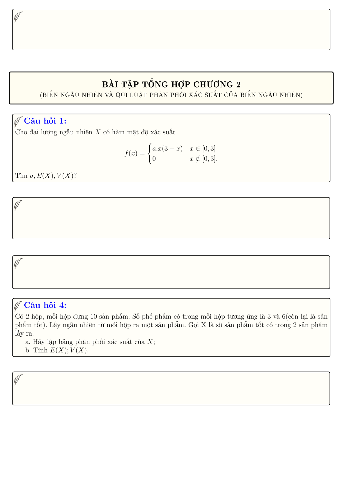 được. Hãy lập bảng phân phối xác suất của X; tính kì vọng E(X), phương sai V (X)? Câu hỏi 5: