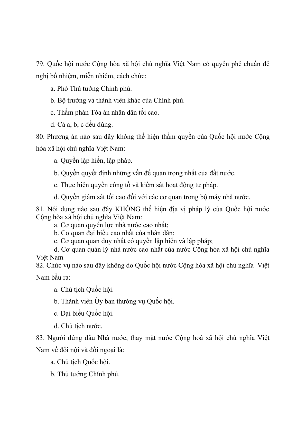 82. Chức vụ nào sau đây không do Quốc hội nước Cộng hòa xã hội chủ nghĩa Việt Nam bầu ra: a. Chủ tịch Quốc hội.