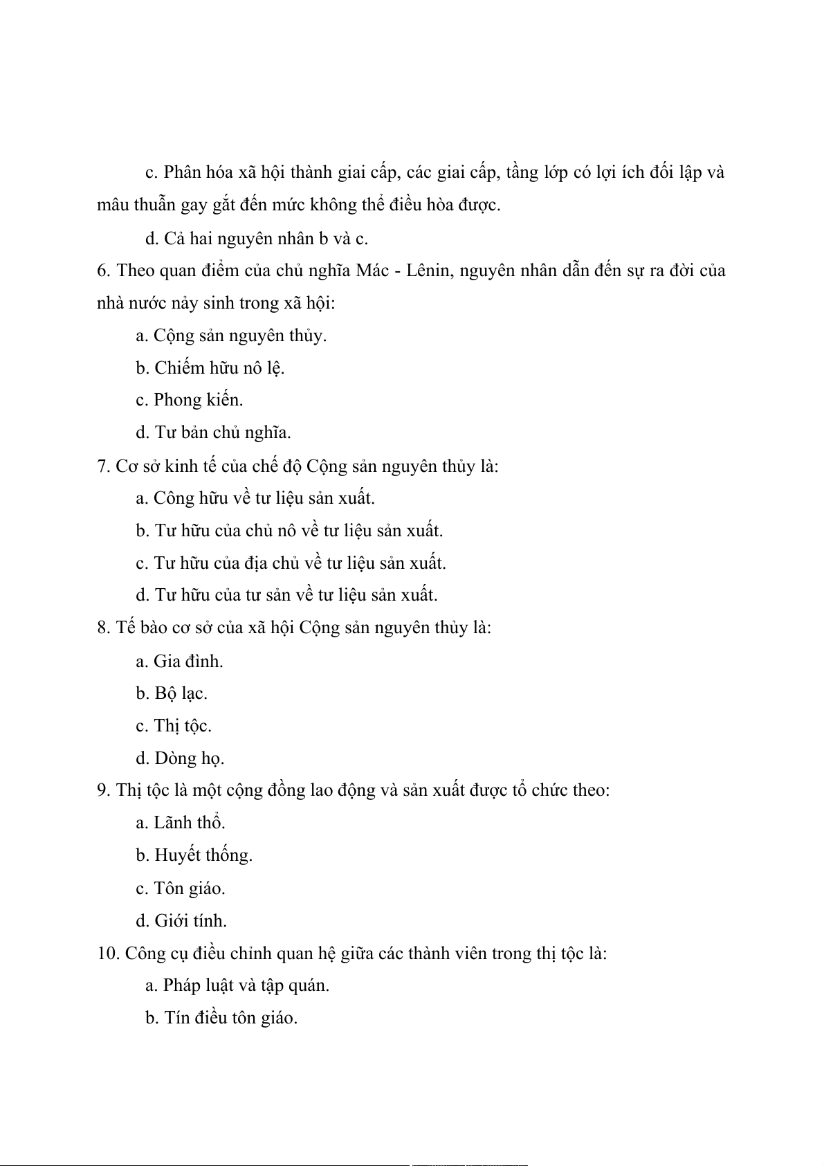 8. Tế bào cơ sở của xã hội Cộng sản nguyên thủy là: a. Gia đình. b. Bộ lạc. c. Thị tộc. d. Dòng họ.