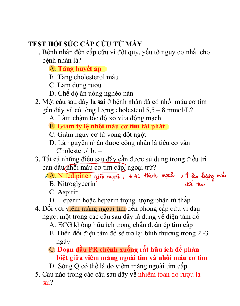 1. Bệnh nhân đến cấp cứu vì đột quỵ, yếu tố nguy cơ nhất cho bệnh nhân là? A. Tăng huyết áp B. Tăng cholesterol máu C. Lạm dụng rượu