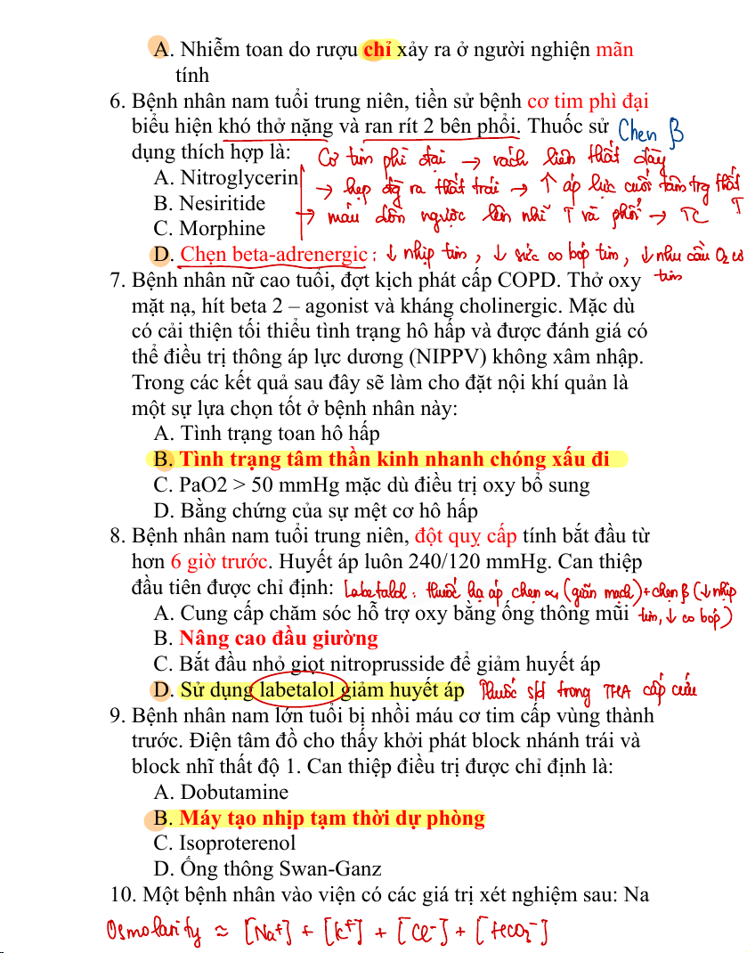 biểu hiện khó thở nặng và ran rít 2 bên phổi. Thuốc sử dụng thích hợp là: A. Nitroglycerin B. Nesiritide C. Morphine D. Chẹn beta-adrenergic