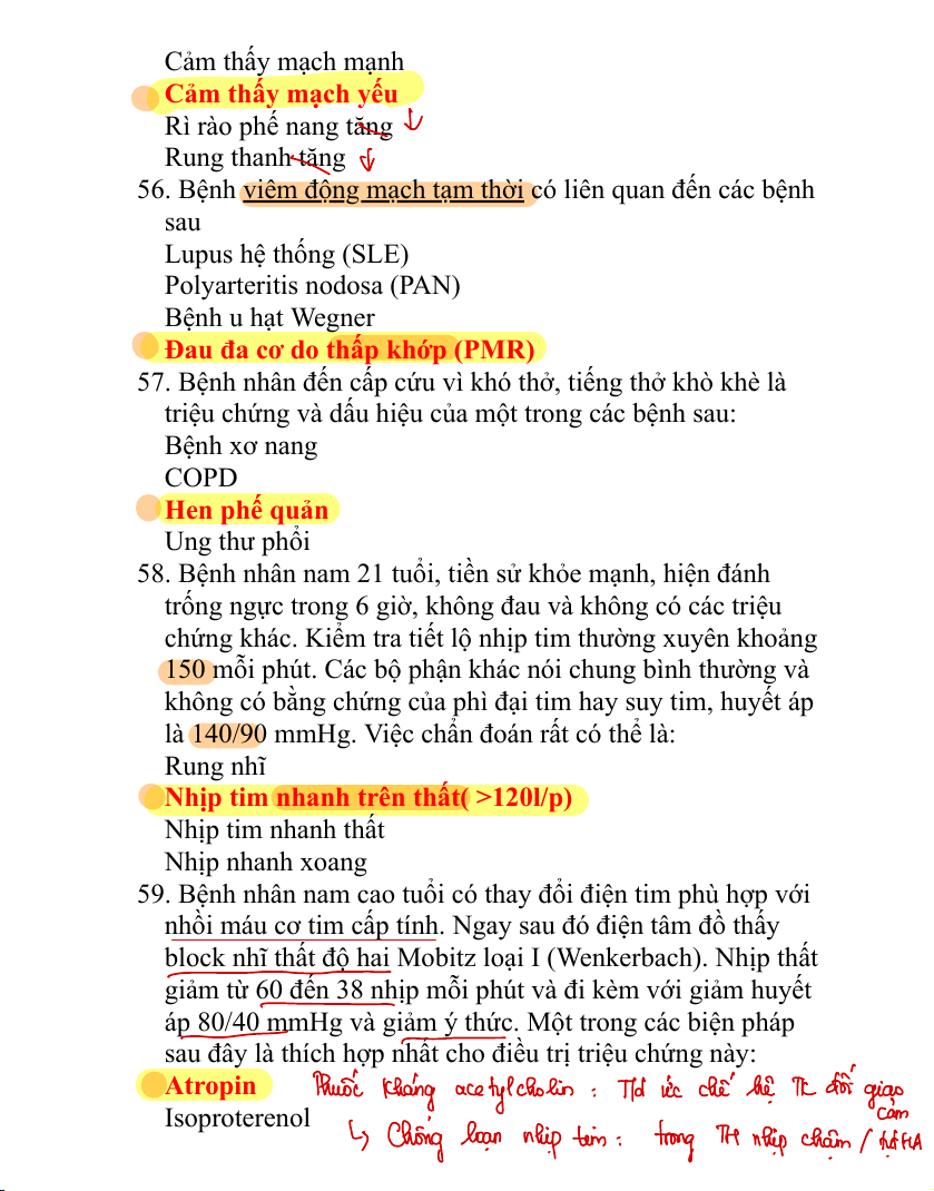 56. Bệnh viêm động mạch tạm thời có liên quan đến các bệnh sau Lupus hệ thống (SLE) Polyarteritis nodosa (PAN) Bệnh u hạt Wegner