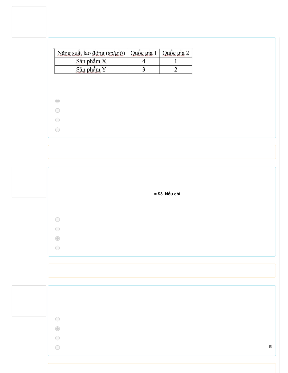 Cho năng suất lao ộng sản xuất ra sản phẩm X và Y của Quốc gia 1 và 2:
