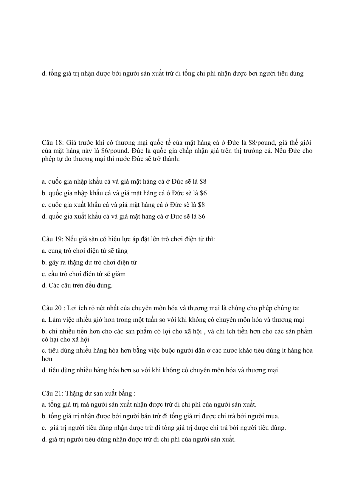 Câu 18: Giá trước khi có thương mại quốc tế của mặt hàng cá ở Đức là $8/pound, giá thế giới