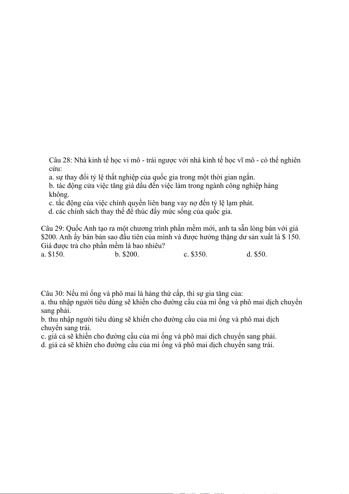 Câu 28: Nhà kinh tế học vi mô - trái ngược với nhà kinh tế học vĩ mô - có thể nghiên cứu: