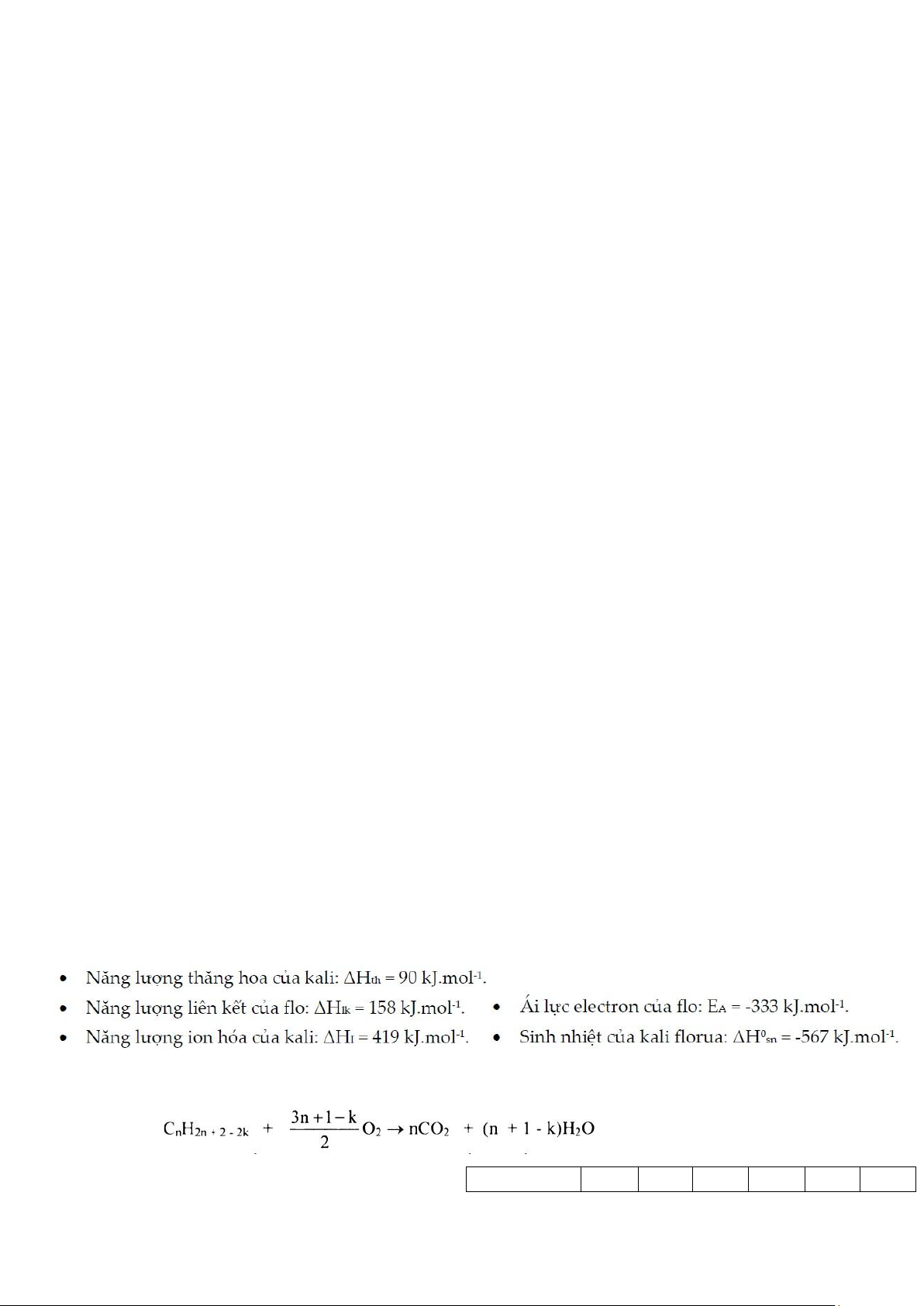 Câu 10: Cho các thông số sau đây. Hãy tính năng lượng mạng lưới tinh thể của KF (kJ/mol): A. -822 kJ/mol. B. -902 kJ/mol. C. -507 kJ/mol. D. -412 kJ/mol.
