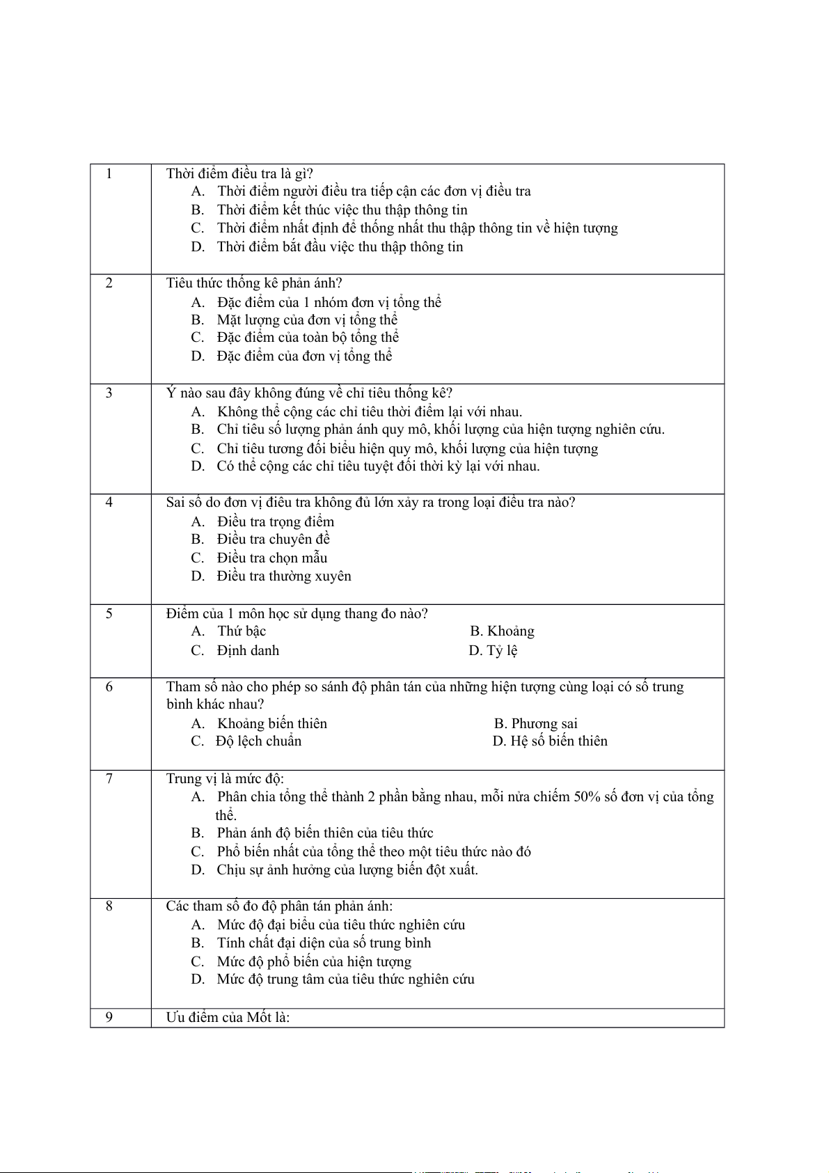 A. Khoảng biến thiên B. Phương sai C. Độ lệch chuẩn D. Hệ số biến thiên 7 Trung vị là mức độ: