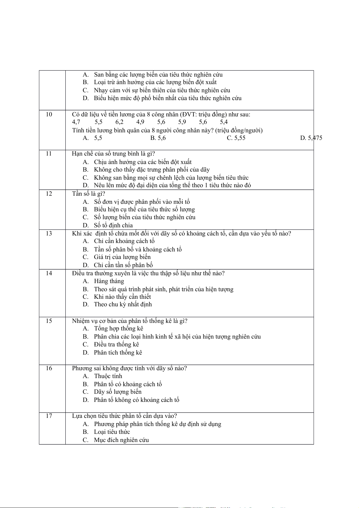 Tính tiền lương bình quân của 8 người công nhân này? (triệu đồng/người) A. 5,5 B. 5,6 C. 5,55 D. 5,475 11