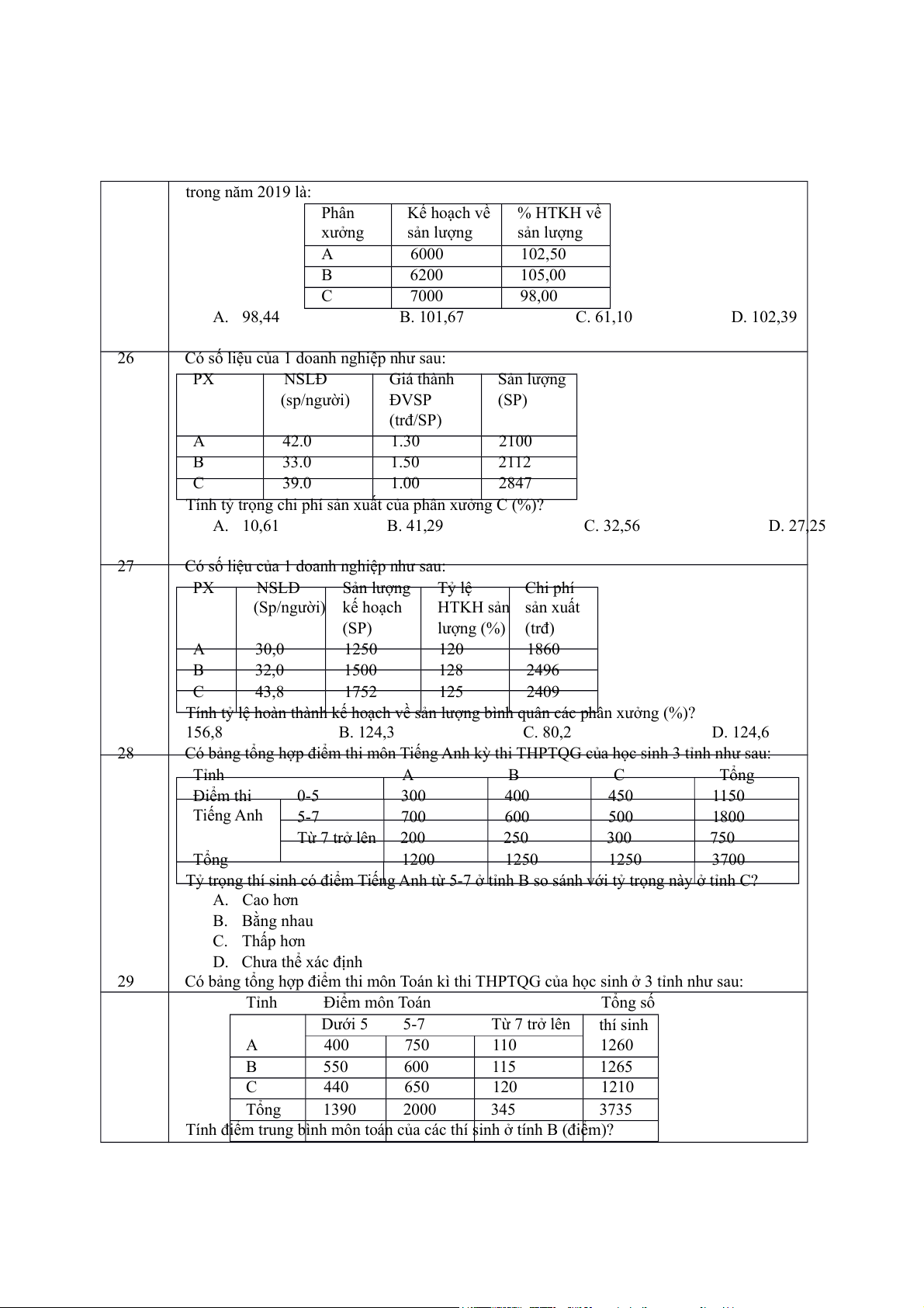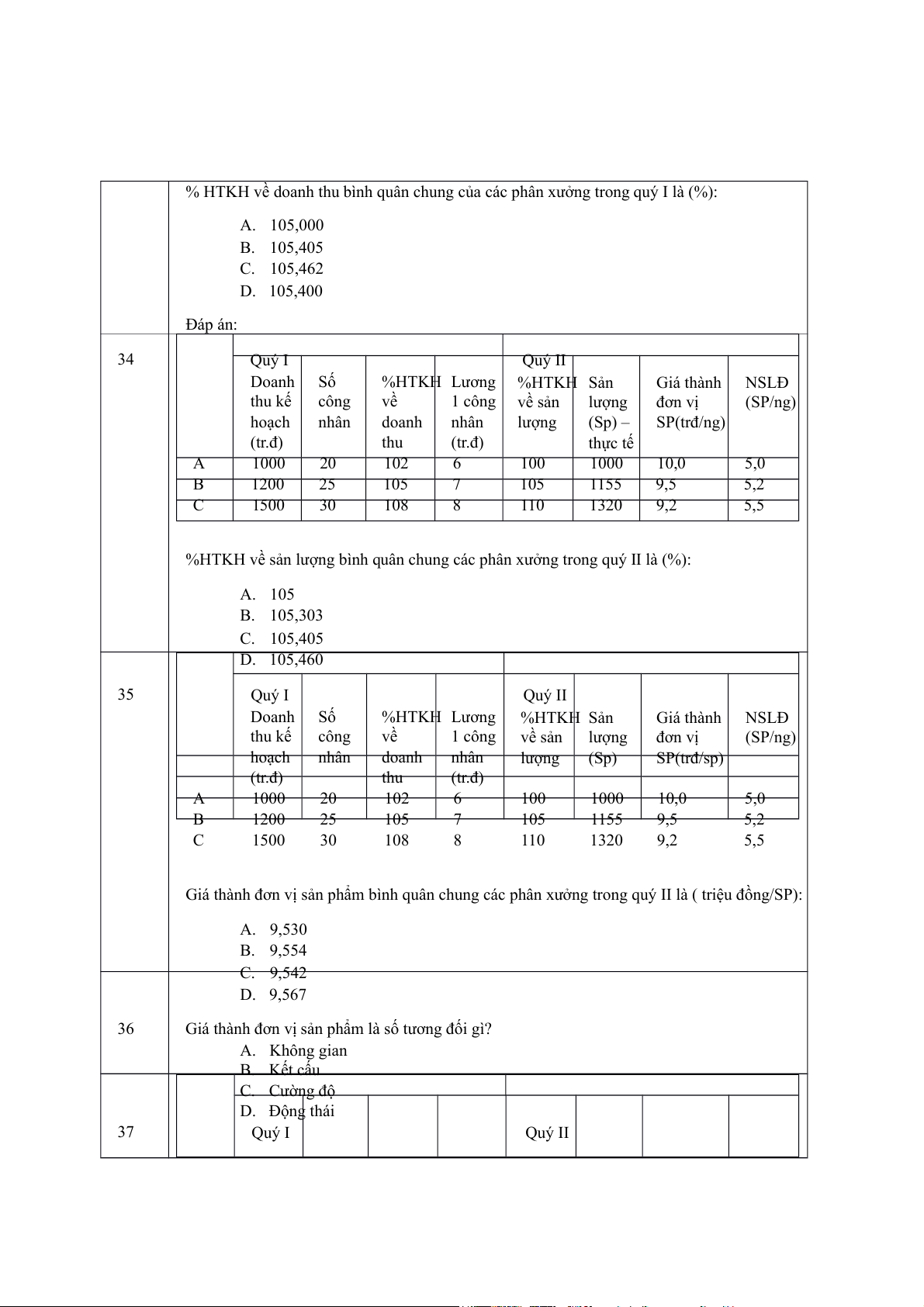 Giá thành đơn vị sản phẩm bình quân chung các phân xưởng trong quý II là ( triệu đồng/SP): A. 9,530 B. 9,554 C. 9,542 D. 9,567 36