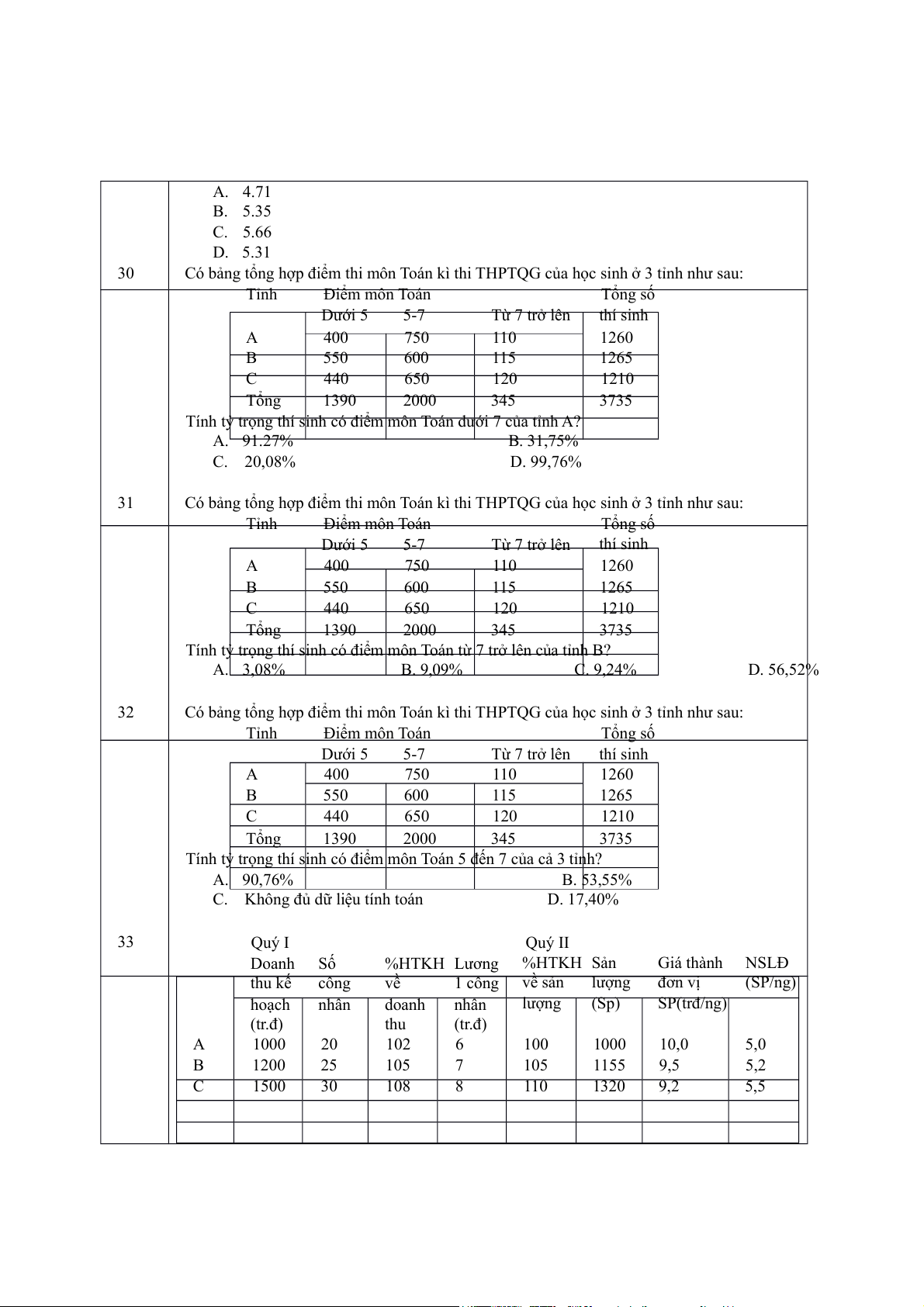 Tính điểm trung bình môn toán của các thí sinh ở tính B (điểm)? A. 4.71 B. 5.35 C. 5.66 D. 5.31 30