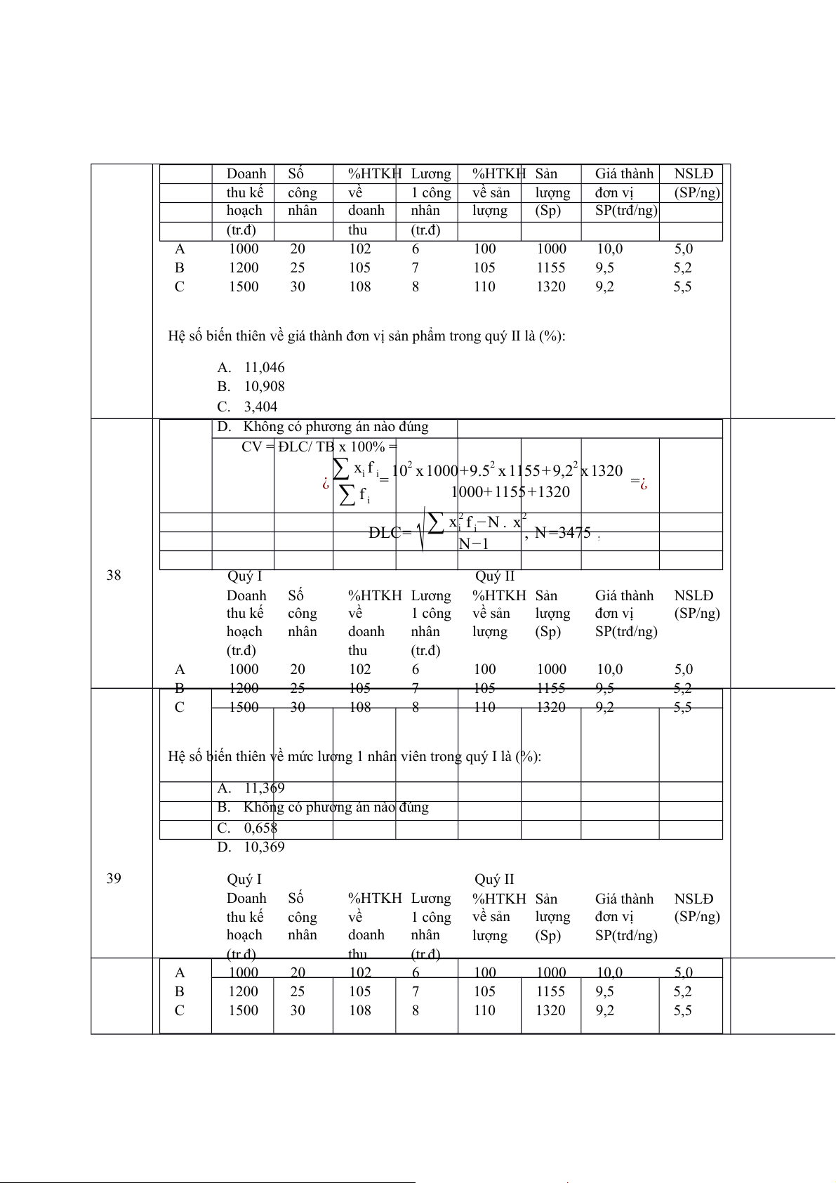 B. Không có phương án nào đúng C. 0,658 D. 10,369 39 Quý I Quý II Doanh Số %HTKH Lương %HTKH Sản Giá thành NSLĐ thu kế công về 1 công về sản lượng đơn vị (SP/ng) hoạch nhân doanh nhân lượng (Sp) SP(trđ/ng) (tr.đ) thu (tr.đ) A 1000 20 102 6 100 1000 10,0 5,0 B 1200 25 105 7 105 1155 9,5 5,2 C 1500 30 108 8 110 1320 9,2 5,5