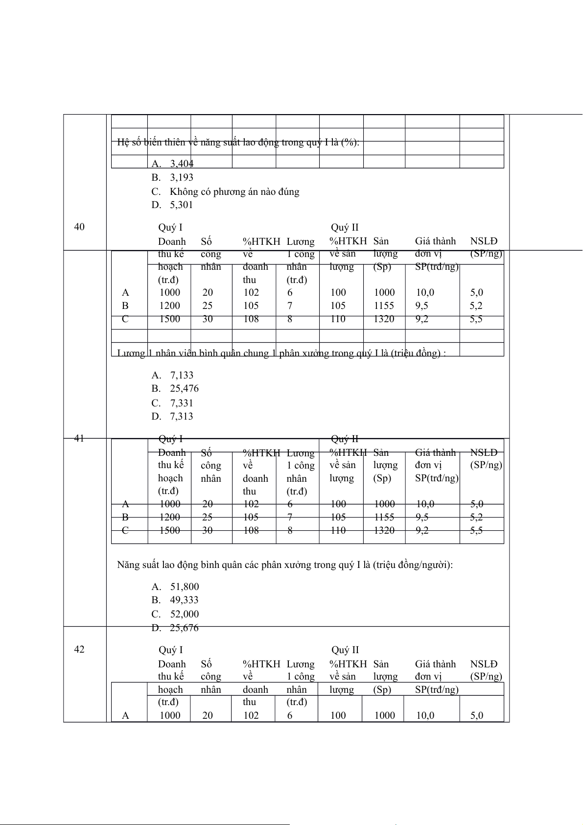 Lương 1 nhân viên bình quân chung 1 phân xưởng trong quý I là (triệu đồng) : A. 7,133 B. 25,476 C. 7,331 D. 7,313 41 Quý I Quý II Doanh Số %HTKH Lương %HTKH Sản Giá thành NSLĐ thu kế công về 1 công về sản lượng đơn vị (SP/ng) hoạch nhân doanh nhân lượng (Sp) SP(trđ/ng) (tr.đ) thu (tr.đ) A 1000 20 102 6 100 1000 10,0 5,0 B 1200 25 105 7 105 1155 9,5 5,2 C 1500 30 108 8 110 1320 9,2 5,5