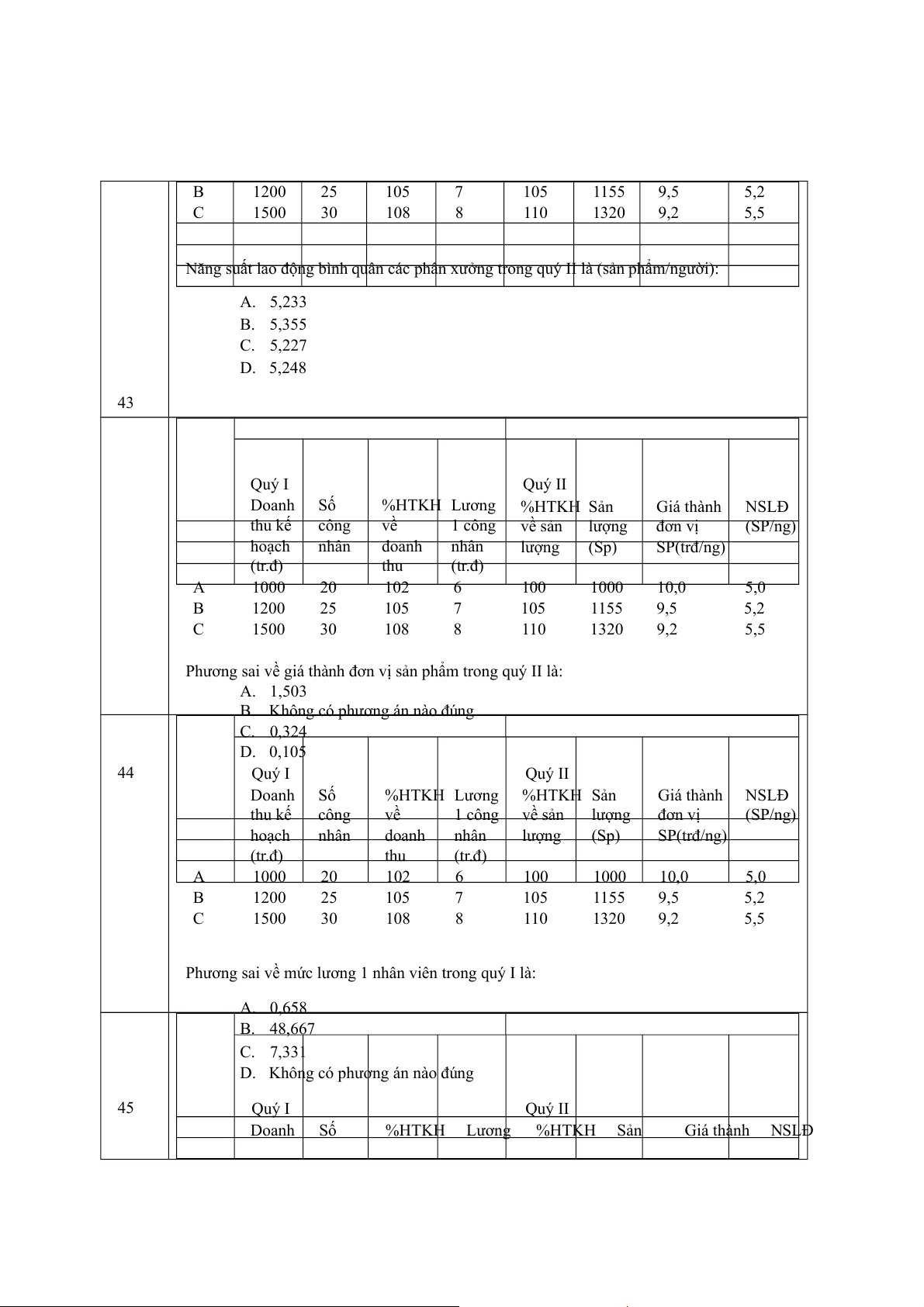 Năng suất lao động bình quân các phân xưởng trong quý II là (sản phẩm/người): A. 5,233 B. 5,355 C. 5,227 D. 5,248 43 Quý I Quý II Doanh Số %HTKH Lương %HTKH Sản Giá thành NSLĐ thu kế công về 1 công về sản lượng đơn vị (SP/ng) hoạch nhân doanh nhân lượng (Sp) SP(trđ/ng) (tr.đ) thu (tr.đ) A 1000 20 102 6 100 1000 10,0 5,0 B 1200 25 105 7 105 1155 9,5 5,2 C 1500 30 108 8 110 1320 9,2 5,5