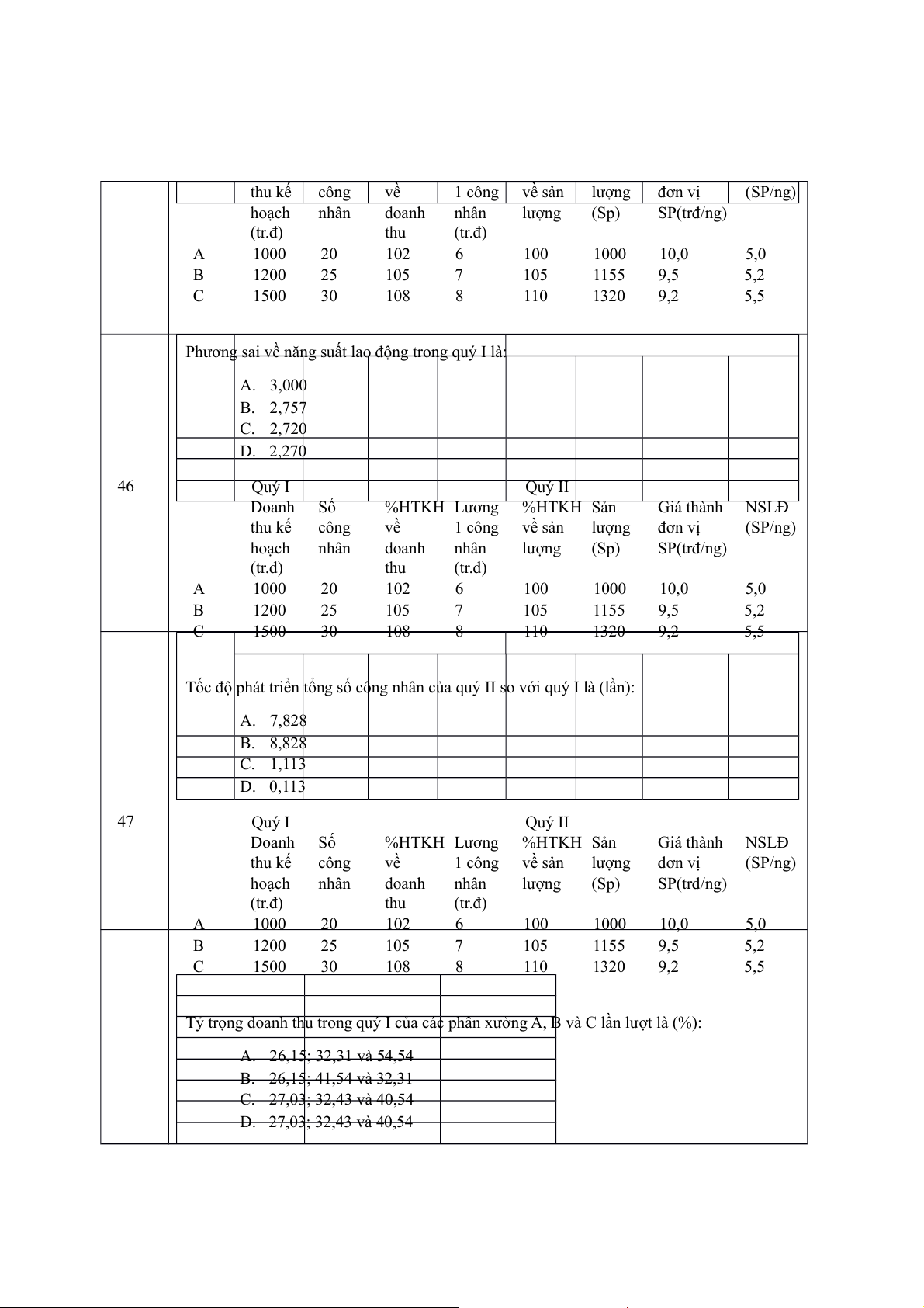 Tốc độ phát triển tổng số công nhân của quý II so với quý I là (lần): A. 7,828 B. 8,828 C. 1,113 D. 0,113 47 Quý I Quý II Doanh Số %HTKH Lương %HTKH Sản Giá thành NSLĐ thu kế công về 1 công về sản lượng đơn vị (SP/ng) hoạch nhân doanh nhân lượng (Sp) SP(trđ/ng) (tr.đ) thu (tr.đ) A 1000 20 102 6 100 1000 10,0 5,0 B 1200 25 105 7 105 1155 9,5 5,2 C 1500 30 108 8 110 1320 9,2 5,5