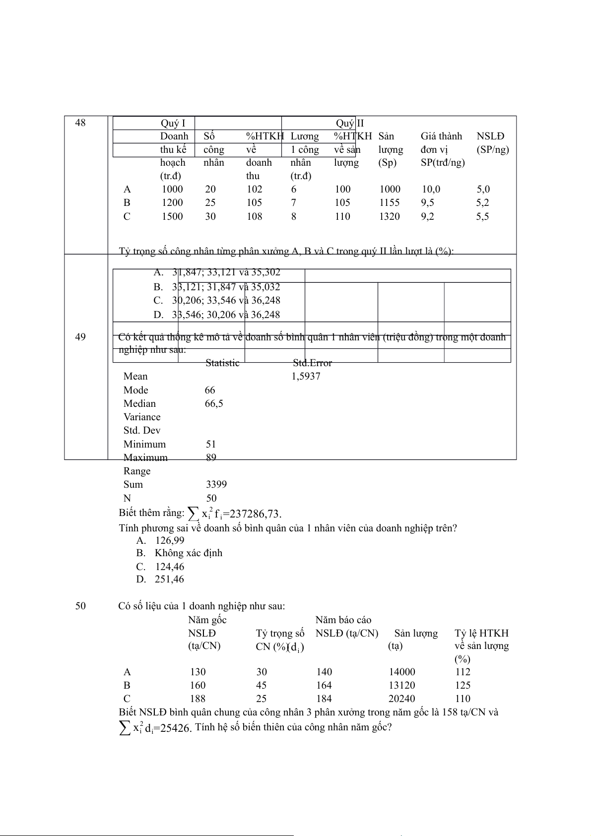 Tỷ trọng số công nhân từng phân xưởng A, B và C trong quý II lần lượt là (%): A. 31,847; 33,121 và 35,302 B. 33,121; 31,847 và 35,032 C. 30,206; 33,546 và 36,248 D. 33,546; 30,206 và 36,248 49