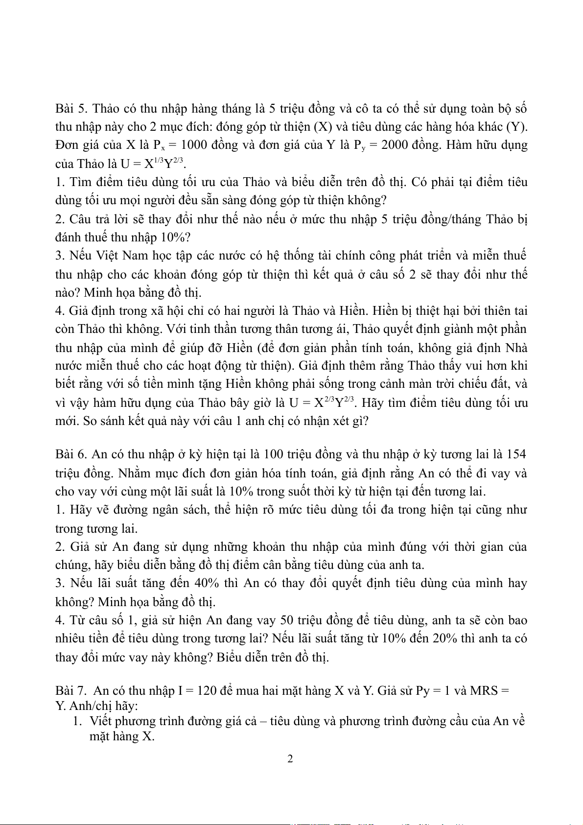 Bài 7. An có thu nhập I = 120 để mua hai mặt hàng X và Y. Giả sử Py = 1 và MRS = Y. Anh/chị hãy: