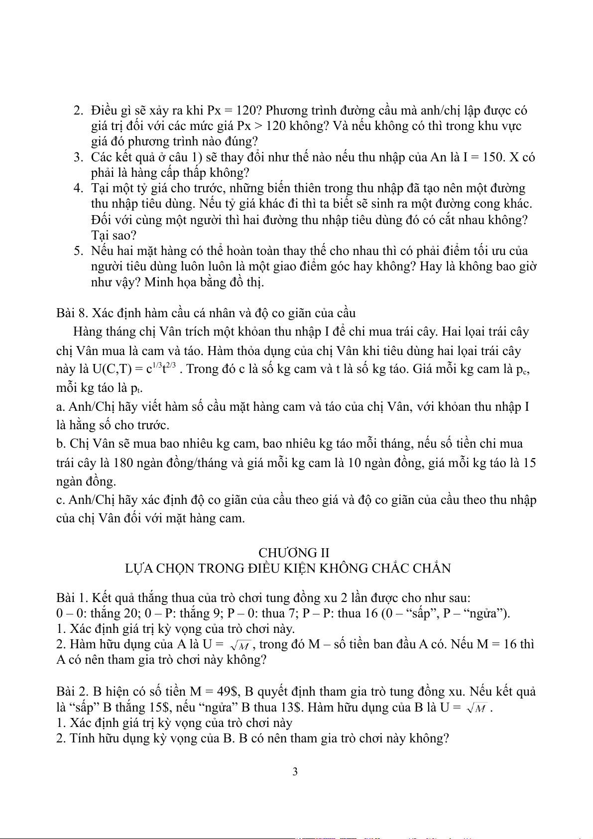 chị Vân mua là cam và táo. Hàm thỏa dụng của chị Vân khi tiêu dùng hai lọai trái cây này là U(C,T) = c1/3t2/3 .