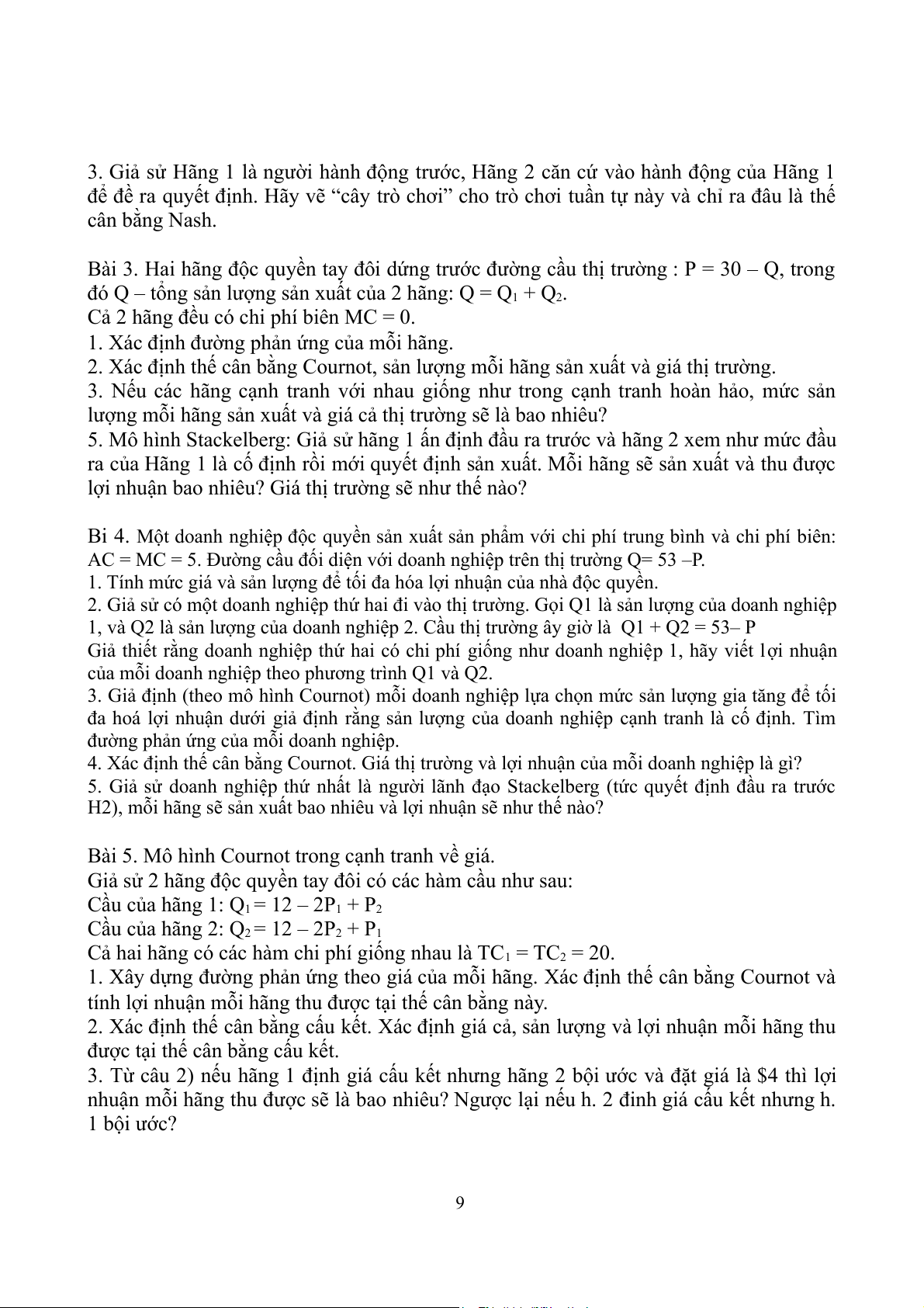 Bài 9. Trong điều kiện cạnh tranh hoàn hảo các doanh nghiệp sẵn sàng cung cấp bất kì