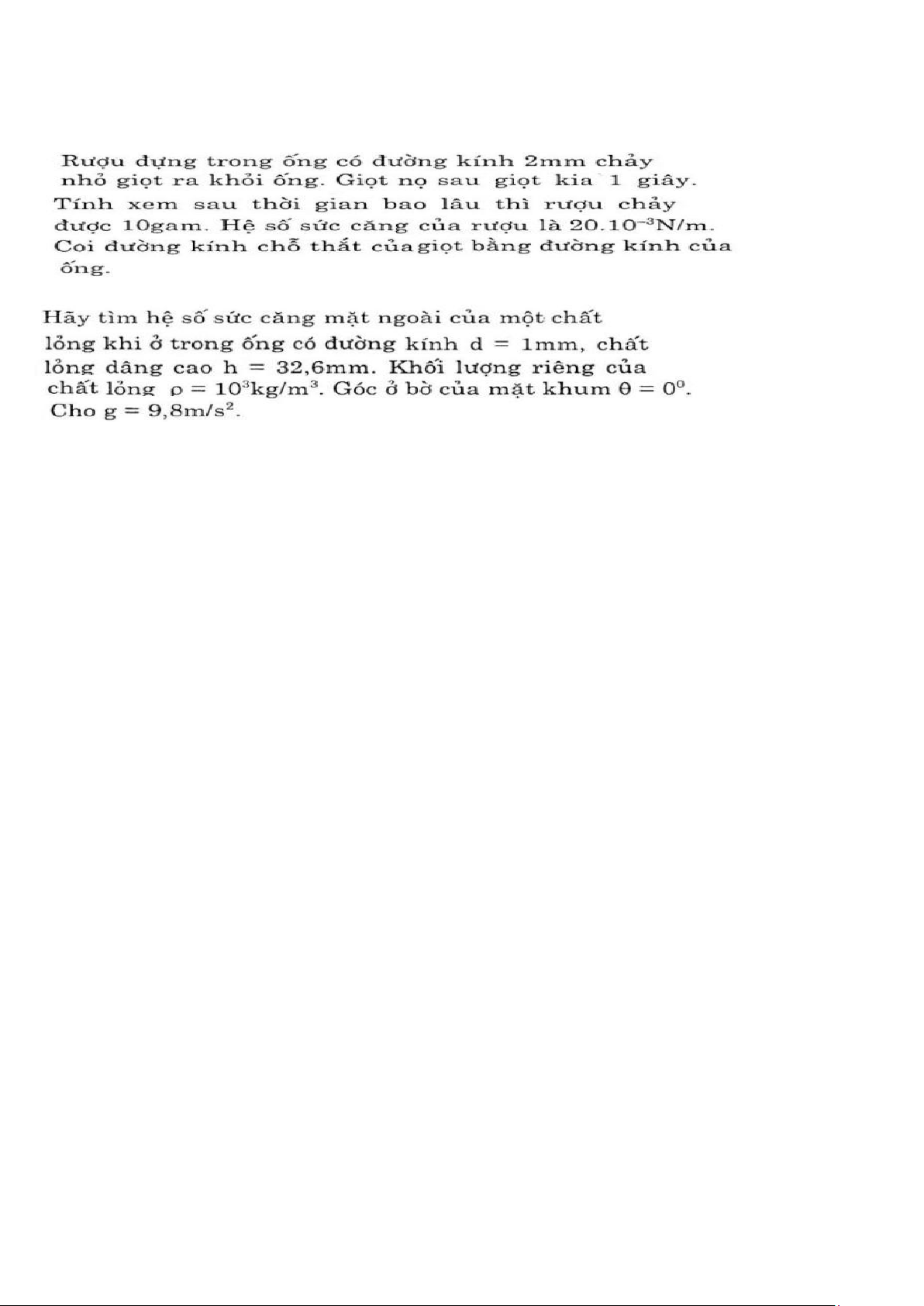 uống trong một ngày, cho biết hệ số căng mặt ngoài của thuốc là 8,5.10-2 N/m, và đầu mút ống nhỏ giọt có đường kính bằng 2 mm ? Bài 2. BÀI 3: BÀI 4: