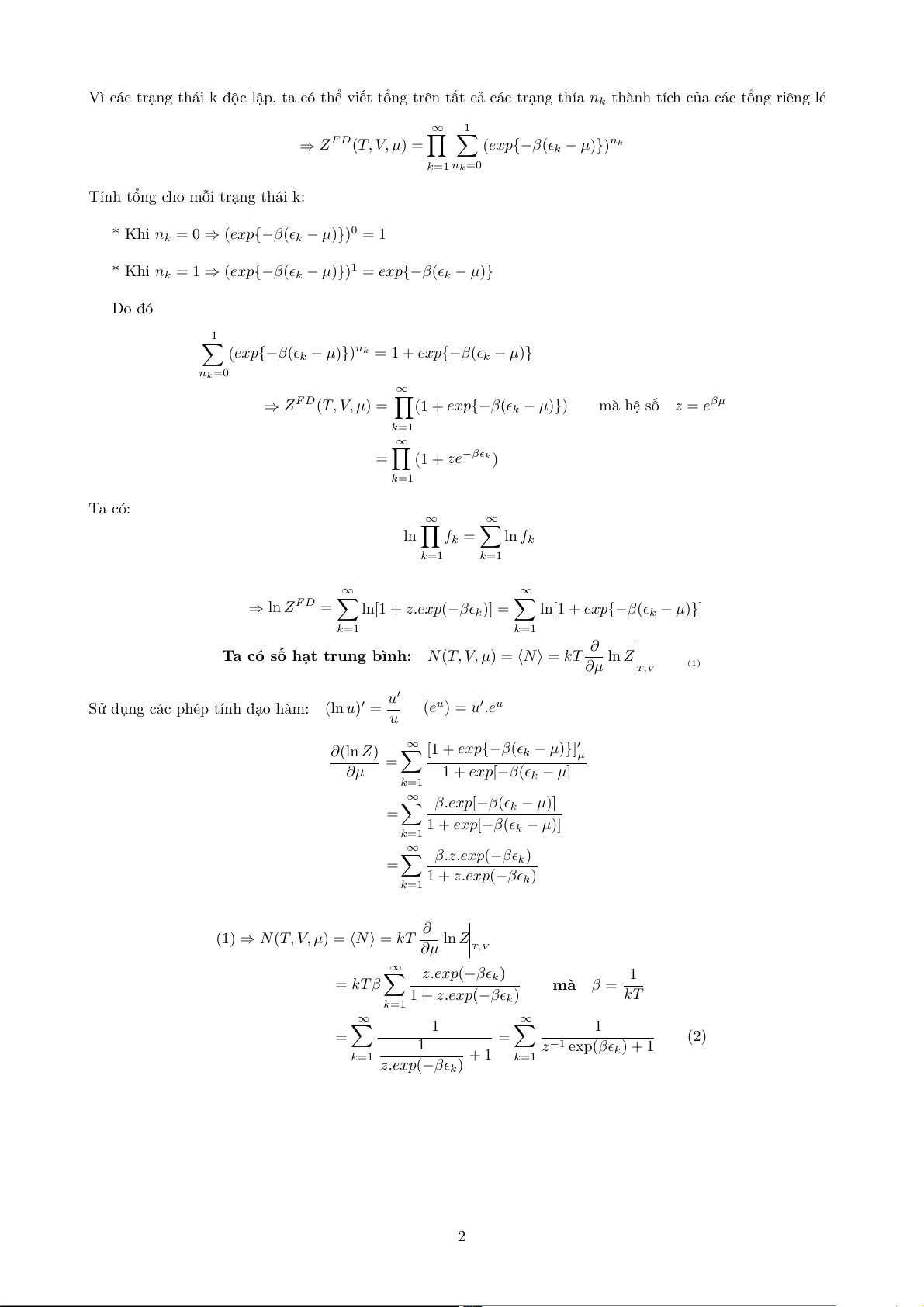 Vì các trạng thái k độc lập, ta có thể viết tổng trên tất cả các trạng thía nk thành tích của các tổng riêng lẻ ∞ 1 Y X ⇒ ZF D(T, V, µ) = (exp{−β(ϵ nk k − µ)}) k=1 nk=0